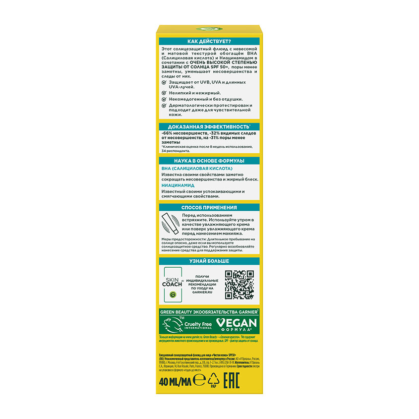 Garnier Skin Naturals Чистая Кожа Солнцезащитный флюид для лица SPF50+ 40 мл 1 шт информация: