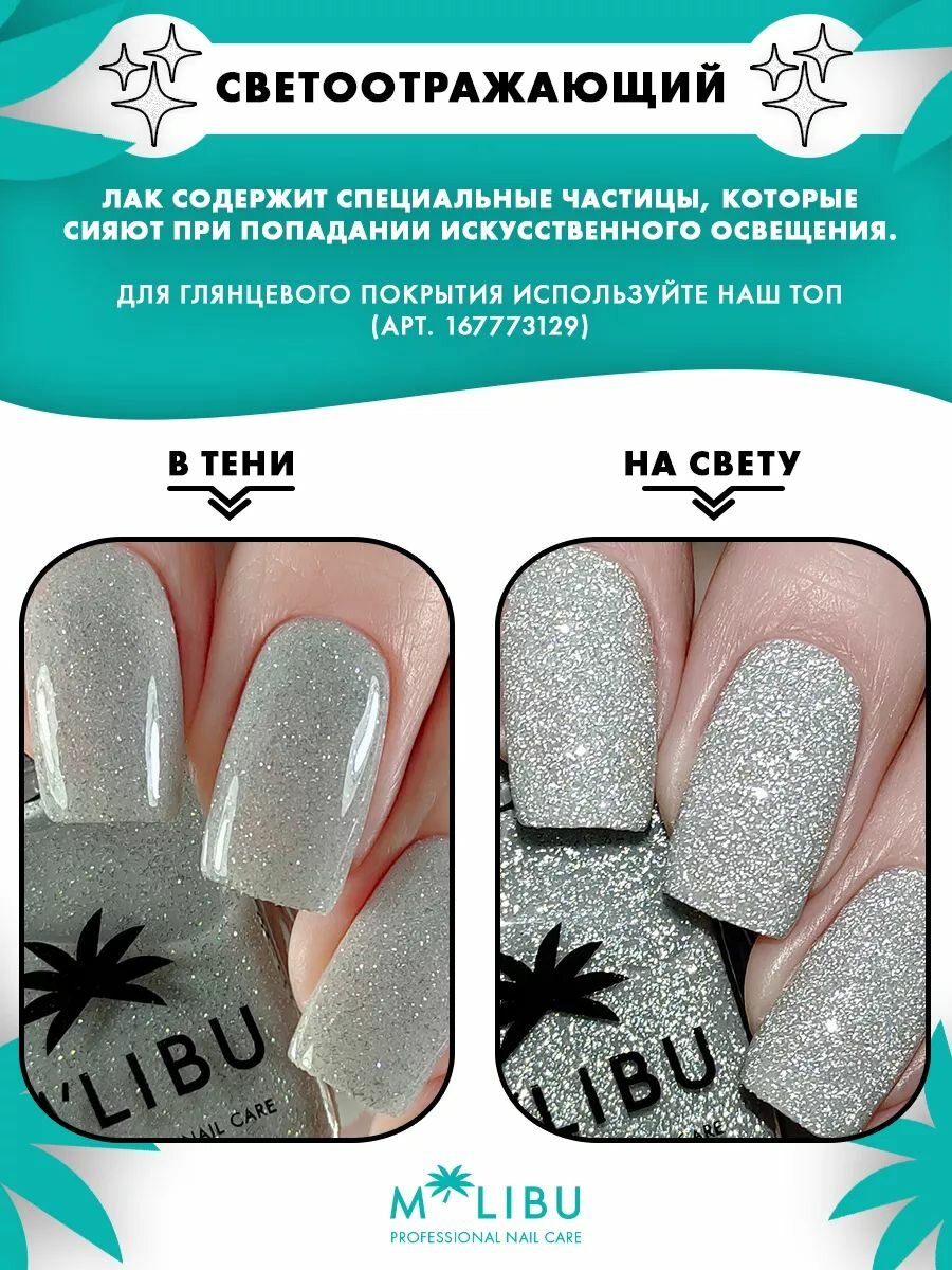 10 цен на Лечебный Лак Для Ногтей Светоотражающий Укрепляющий Серебро MALIBU Gleam