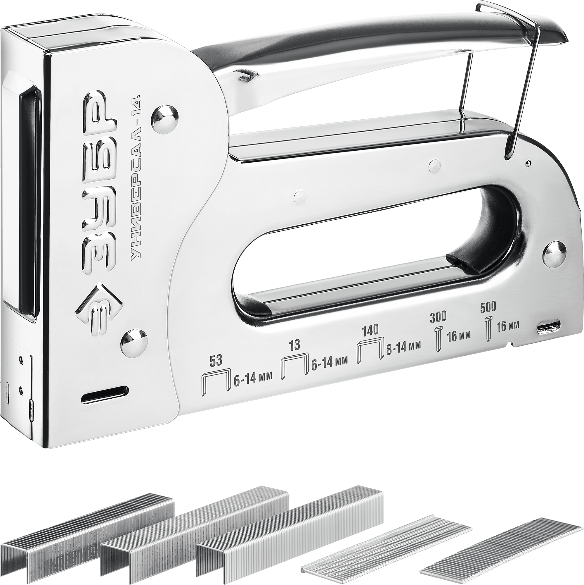 Универсальный стальной cтеплер 6-в-1: 53(6-14мм)/140(8-14 мм)/53F/13/300/500, ЗУБР Универсал-14 31527