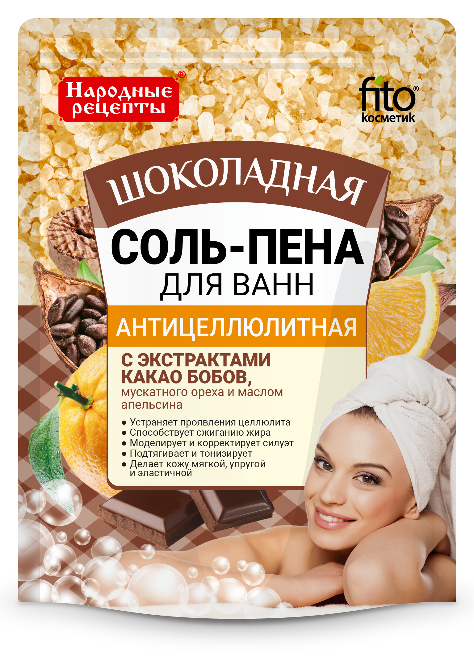 Соль для ванн Народные рецепты шоколадная с пеной, антицеллюлитная, 200гр информация: