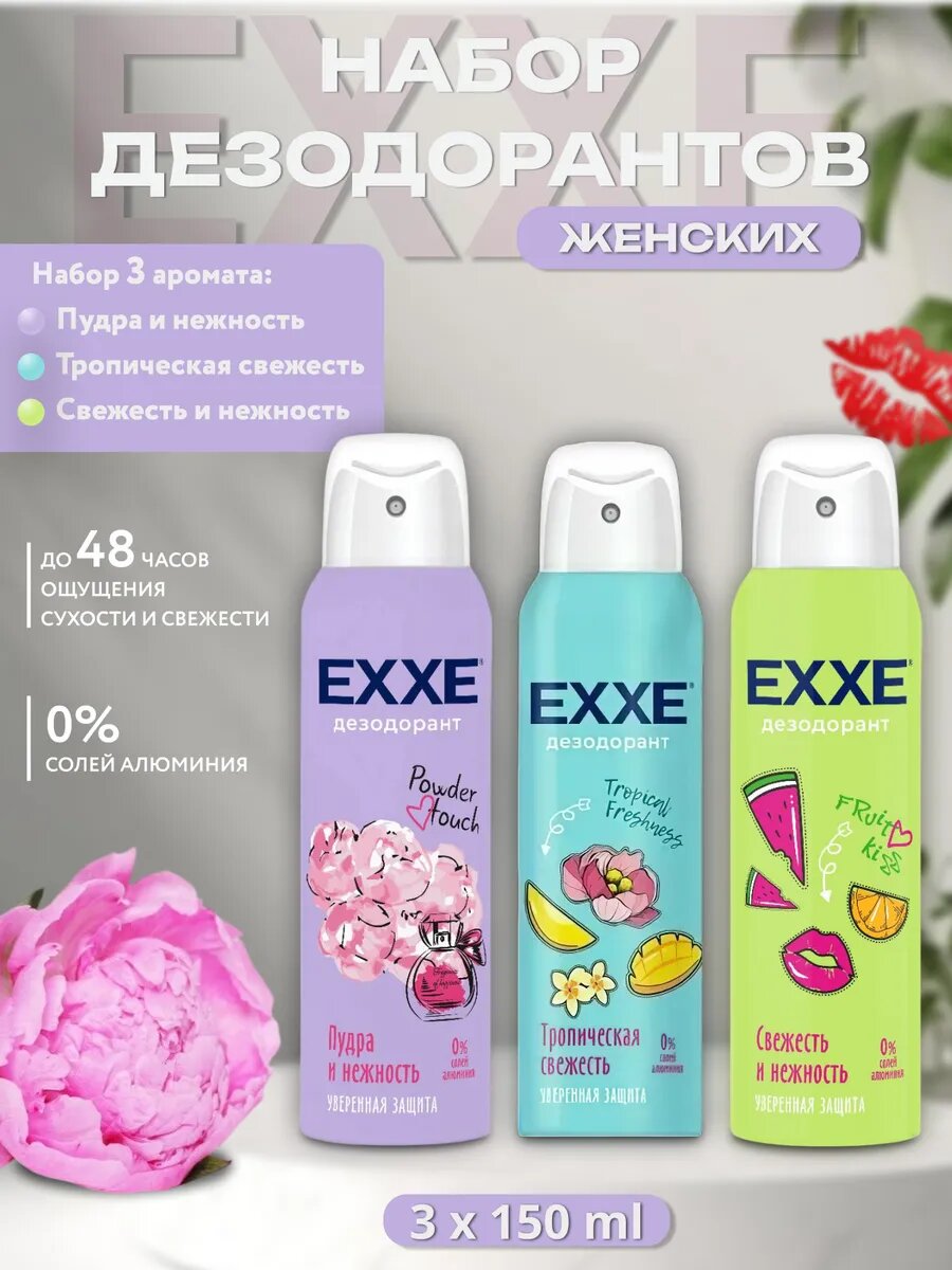 Дезодорант EXXE Микс ароматов, аэрозоль, 3 шт, 150мл, 24-часовая защита информация: