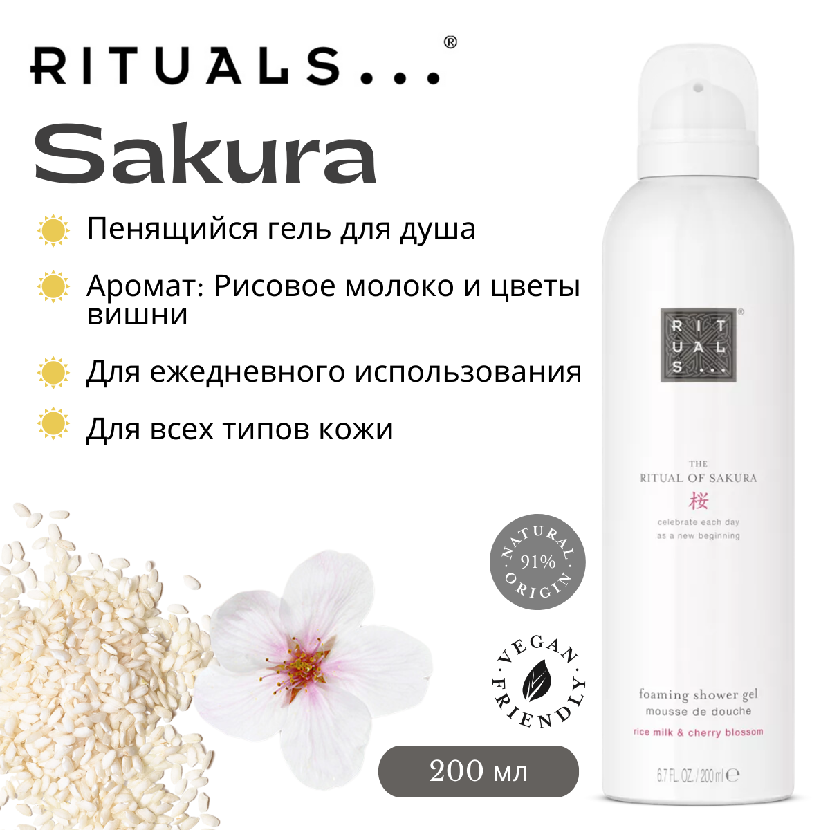 Гель для душа Rituals "Sakura" с ароматом цветов вишни и рисового молока 200 мл. информация: