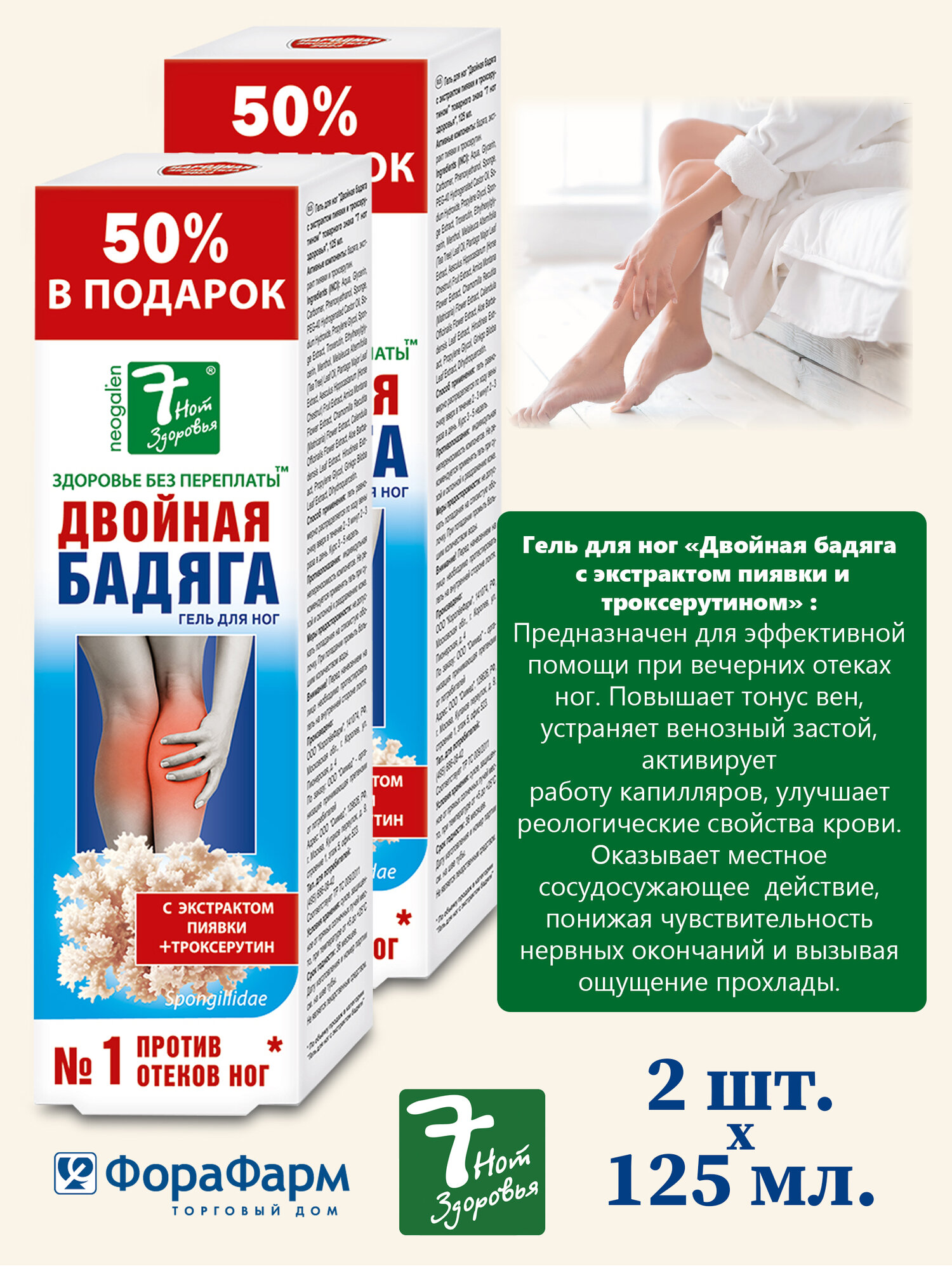 10 цен на Гель для ног «Двойная бадяга с экстрактом пиявки и троксерутином» товарного знака «7 нот здоровья» 125 мл. НПО ФораФарм. Набор 2 шт.