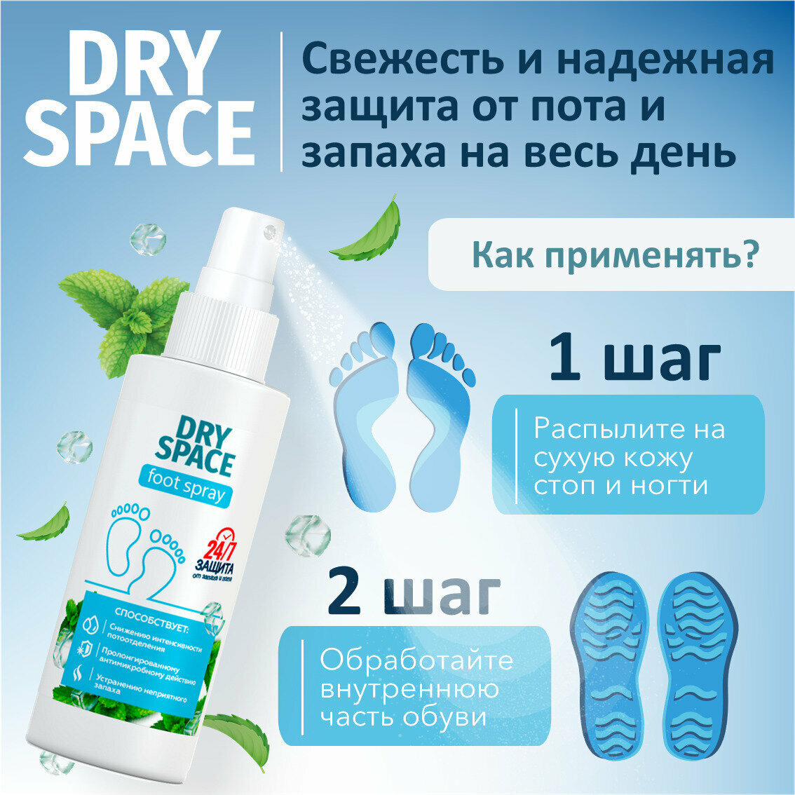 Dry Space спрей для ног от запаха и пота. Дезодорант для обуви от запаха. Спрей Драй спейс 150 мл способствует уменьшению потоотделения ног информация: