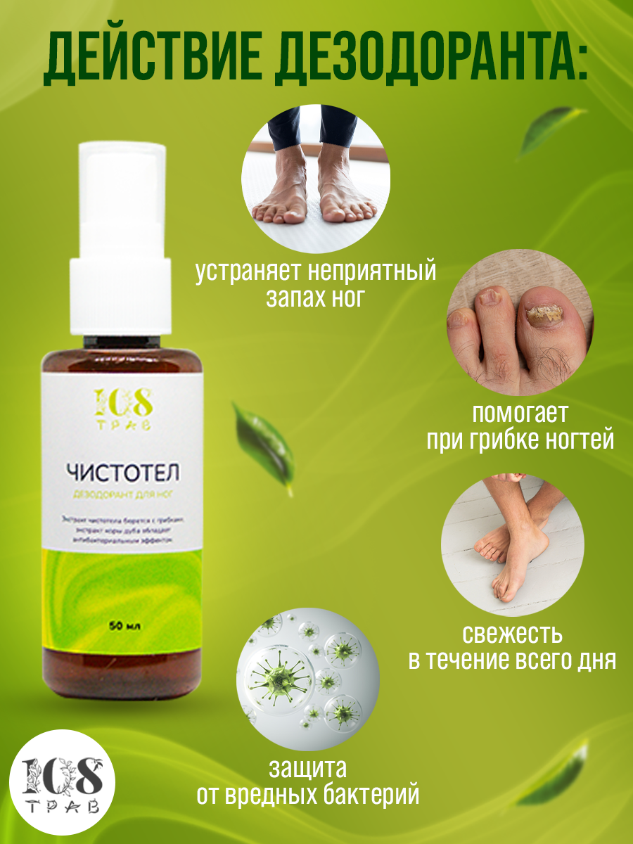 Отзывы на Натуральный дезодорант для женщин и мужчин «Чистотел», от запаха ног, от грибка ногтей / 108 трав. Набор 2 шт по 50мл.