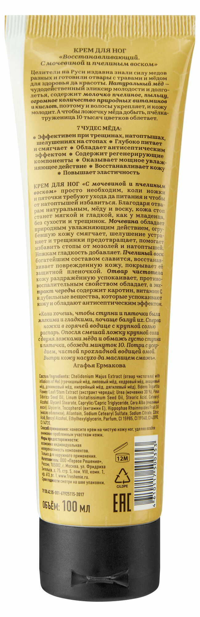 Рецепты бабушки Агафьи, Сибирская травница Крем для ног Восстанавливающий с мочевиной 7 чудес мёда Р, 100мл информация: