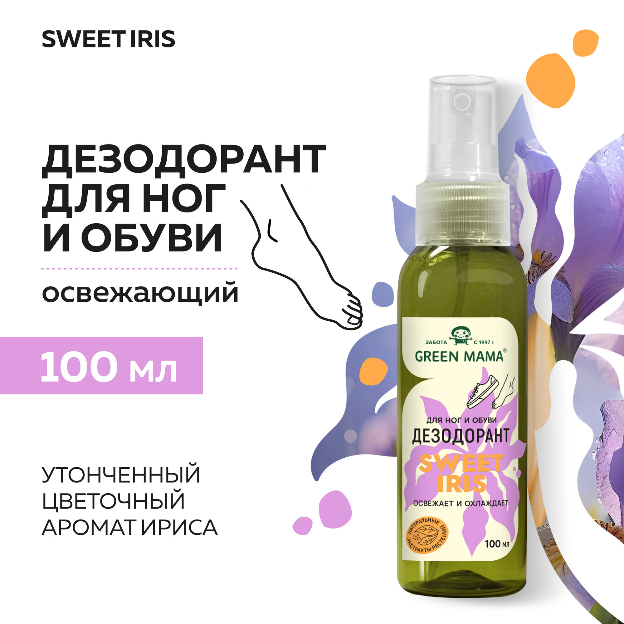 Дезодорант для ног GREEN MAMA с натуральными экстрактами растений SWEET IRIS 100 мл информация: