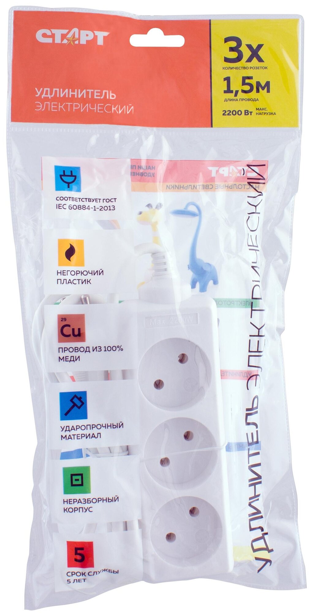 Удлинитель СТАРТ S 3х1, 3 розетки, 1.5 м, б/з, 10А / 2200 Вт