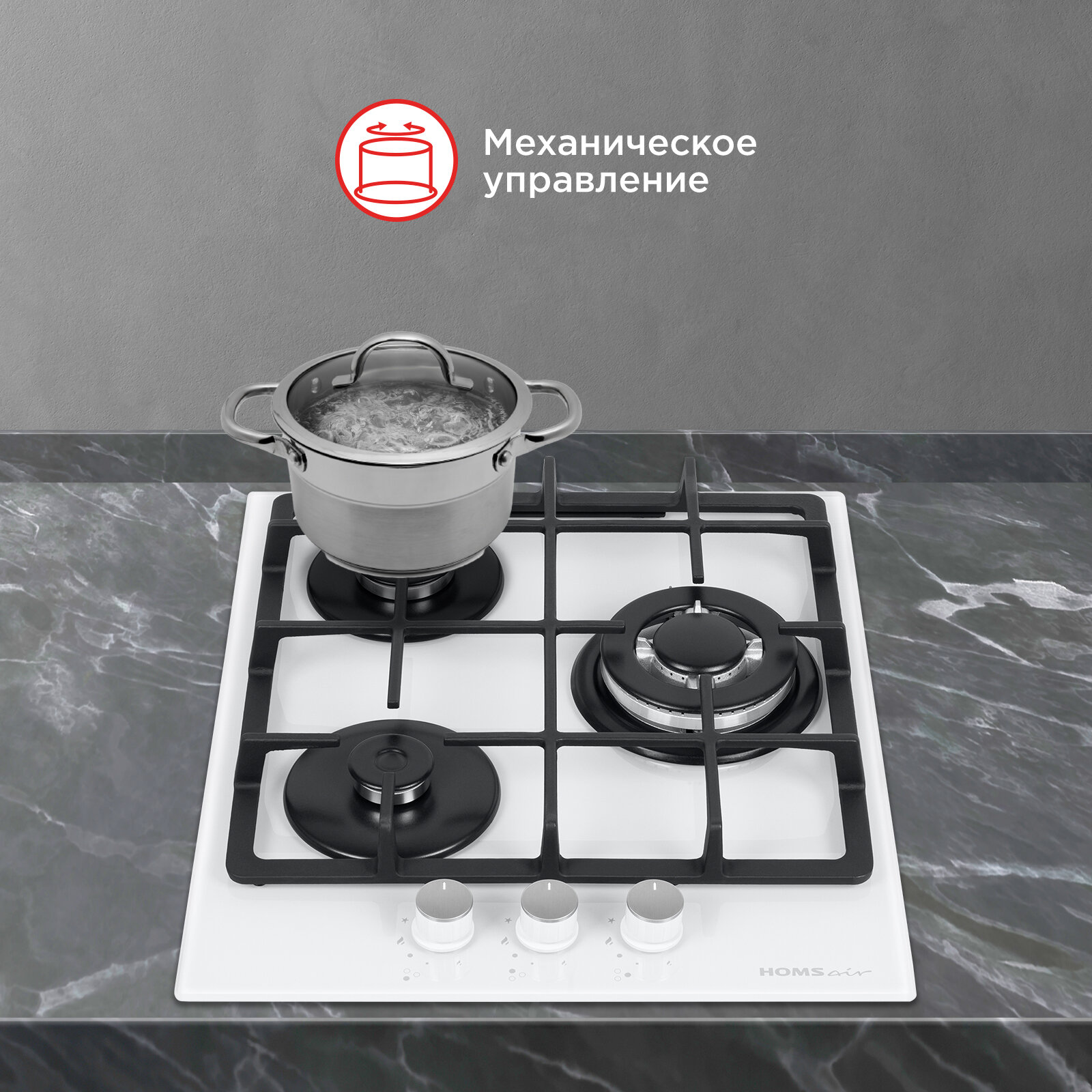 Встраиваемая газовая панель HOMSair/ газ, механическое управление, 3 конфорки, газ контроль, автоподжиг, белый цвет