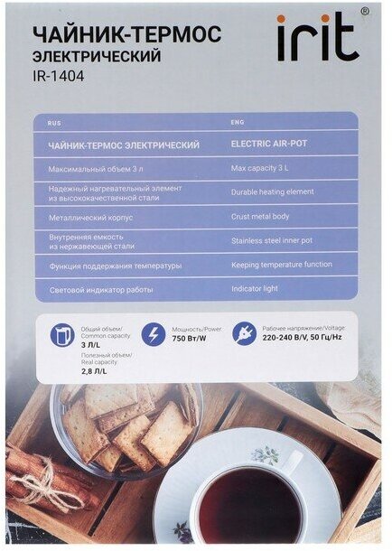 Чайник-термос термопот IRIT IR-1404, 3л, 750Вт, колба нерж.сталь, ручная подача воды