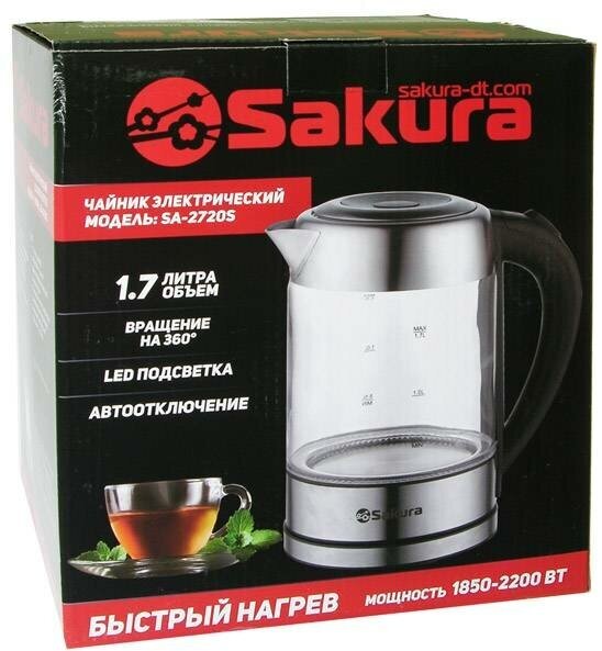 SAKURA Чайник электрический Sakura SA-2720SBK, стекло, 1.7 л, 2200 Вт, серебристый
