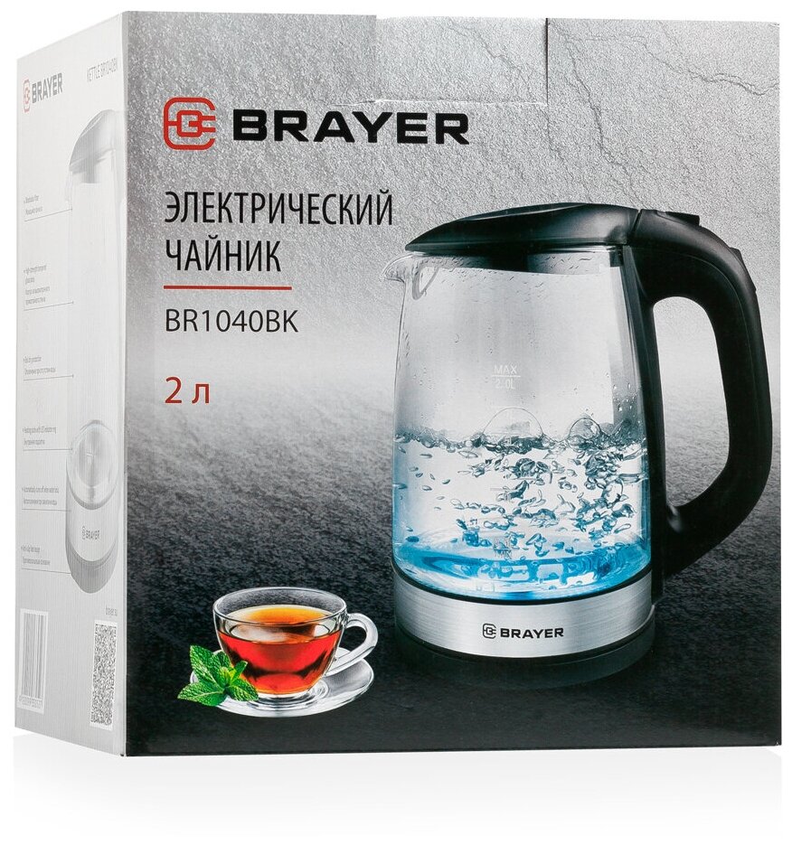 Чайник Brayer 1040BR-BK,2220Вт, 2 л, стекл., черный.