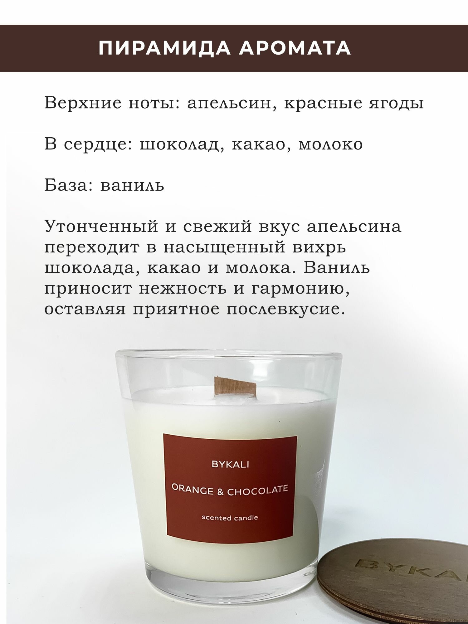 Свеча ароматическая "BYKALI" Апельсин и шоколад - с деревянным фитилем в стакане с крышкой 200 мл информация: