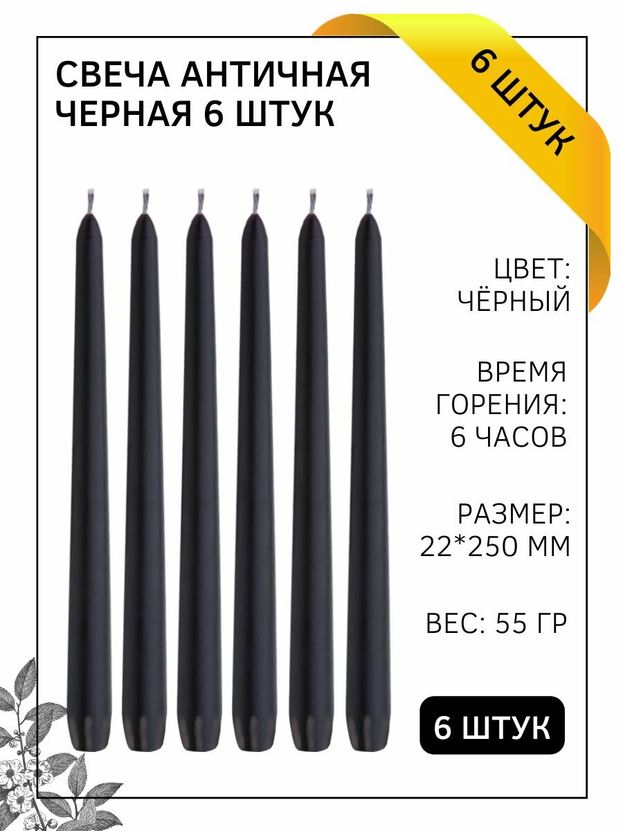Свеча Античная/Столбик/Хозяйственная/Столовая 22х250 мм, черная, 6 ч, 6 штук информация: