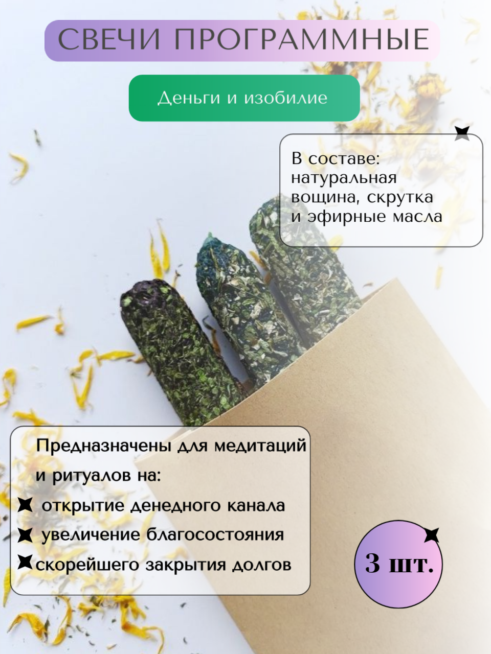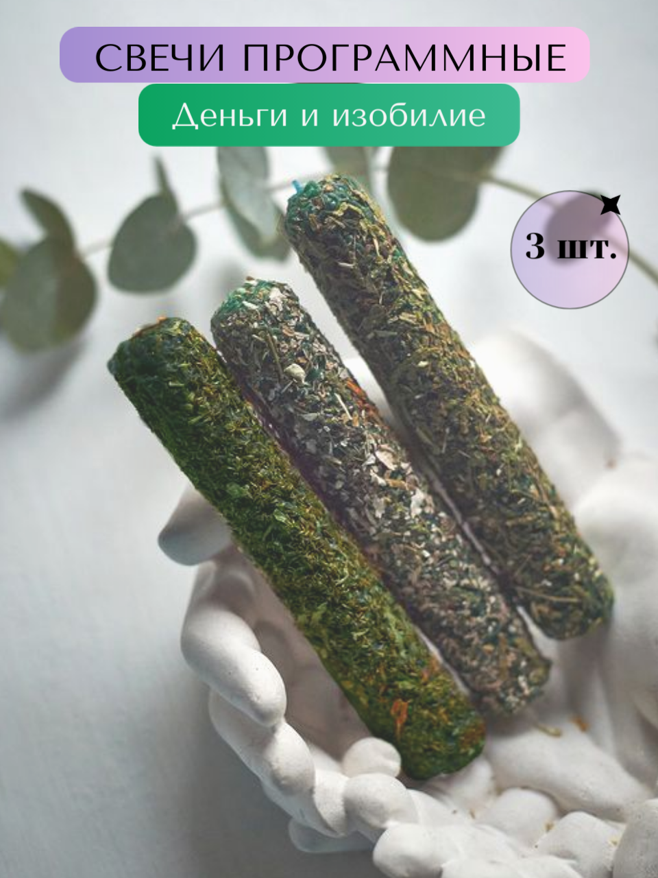 Отзывы на Программные магические свечи с травами и скруткой3 шт "Деньги и изобилие", 13х2 см, зеленый , ручная работа