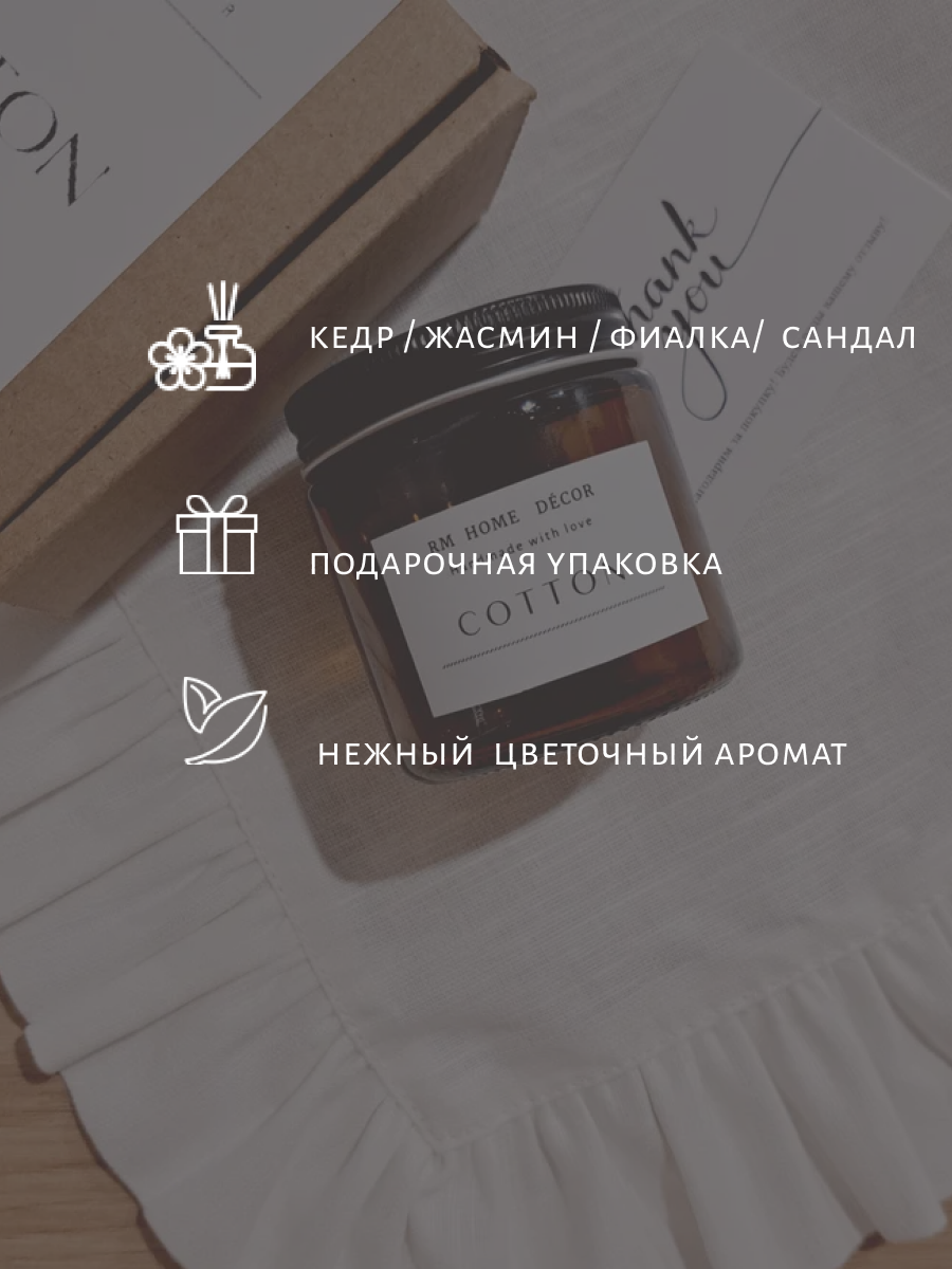 Отзывы на Свеча ароматическая "Cotton", свеча хлопок, свеча с деревянным фитилем, свеча, 100мл, для женщин, свеча пало санто
