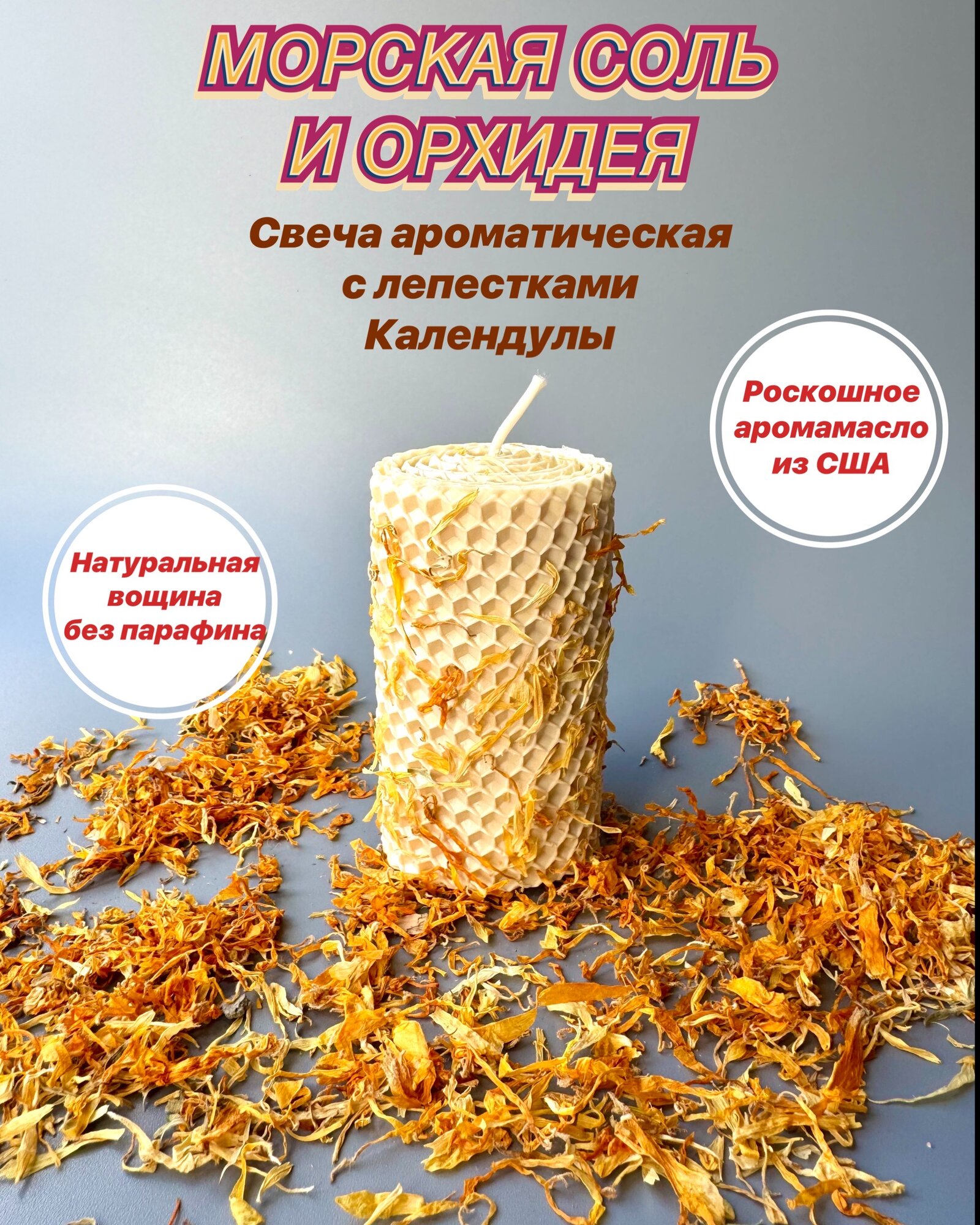 Свеча из вощины ароматическая интерьерная с лепестками Календулы аромат Морская Соль и Орхидея информация: