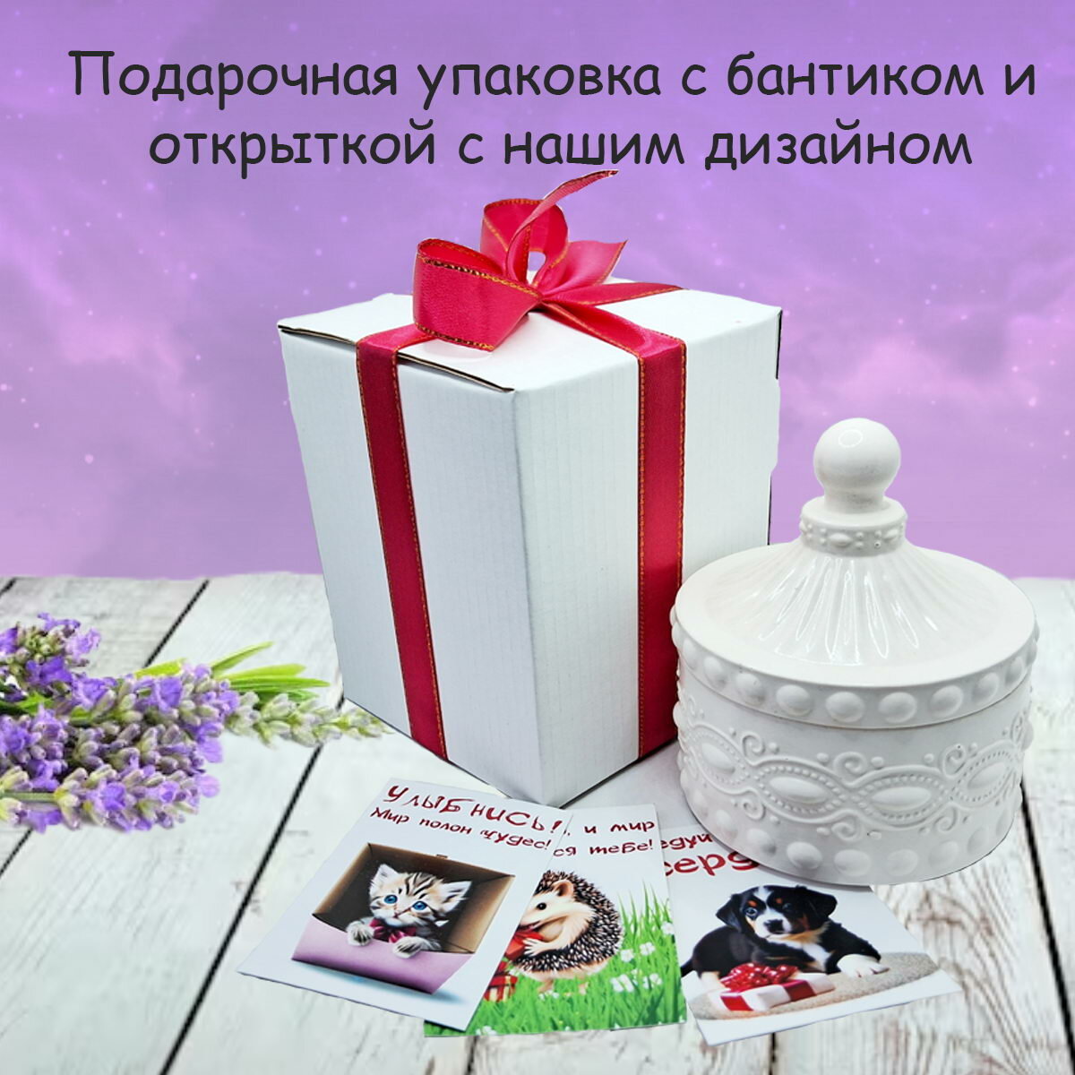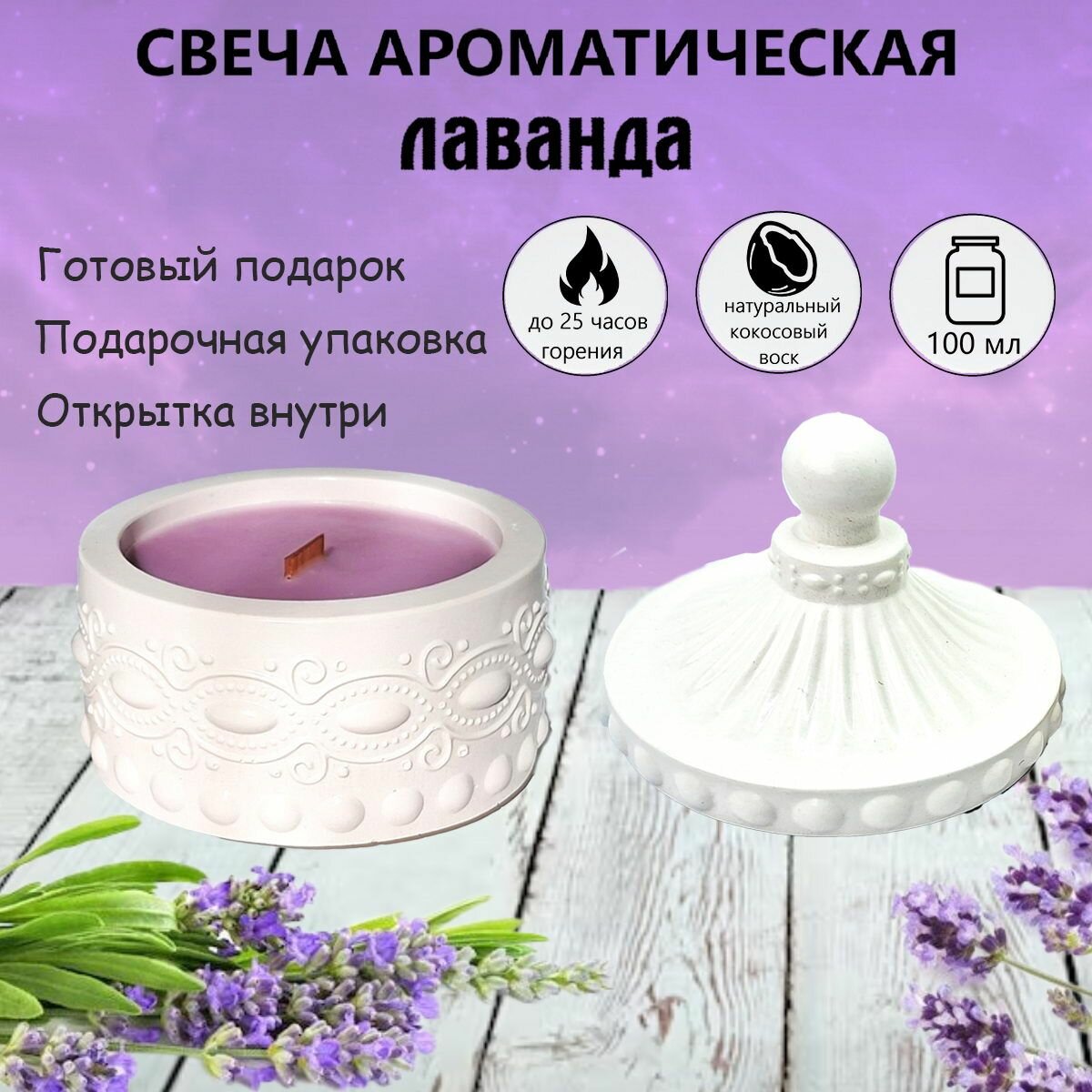 Свеча ароматическая "Лаванда" в подарочной упаковке с открыткой информация: