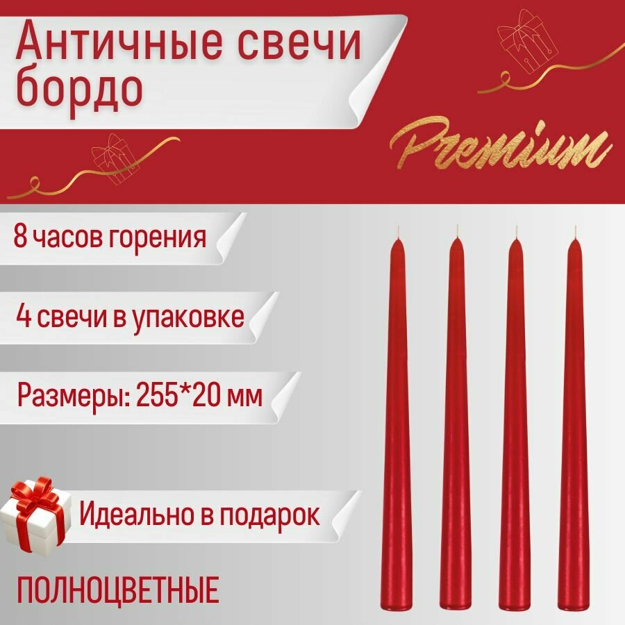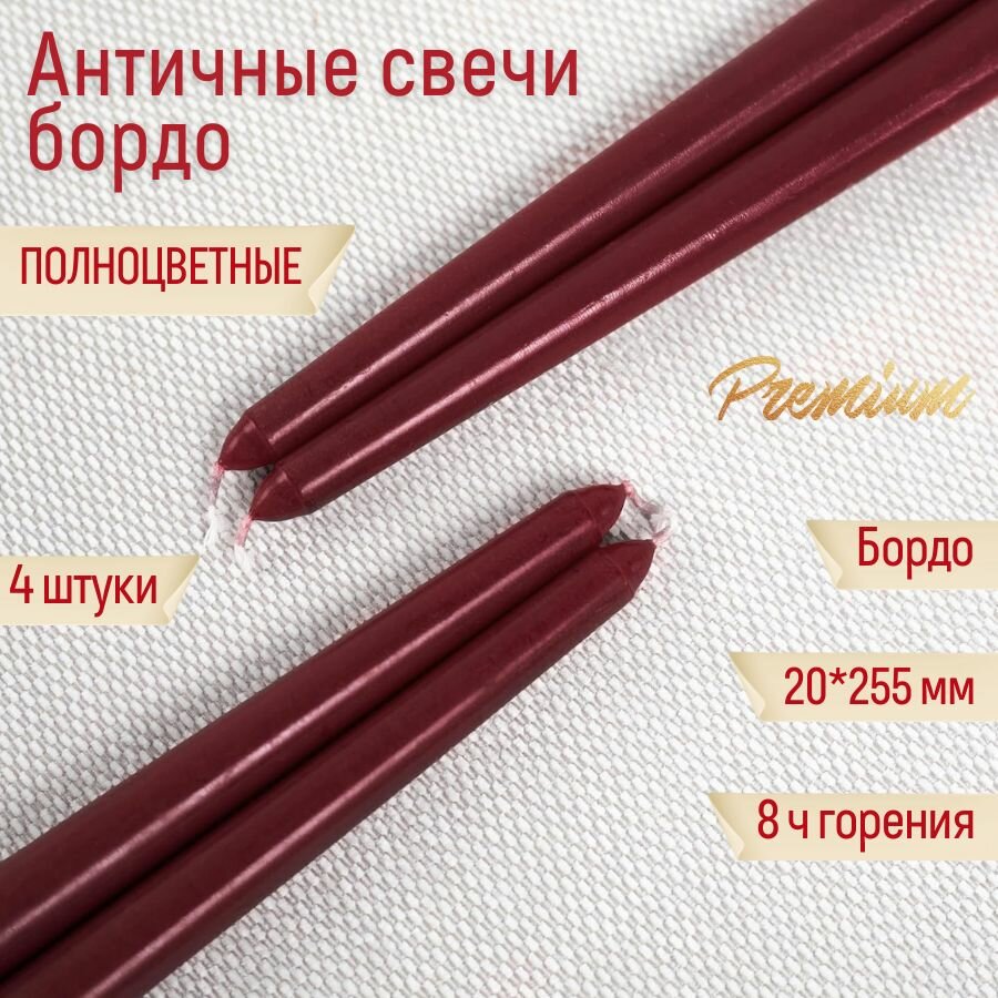 Свеча Античная полноцветная ручной работы 20х255 мм, бордовая, премиум-класс, 4 шт. информация: