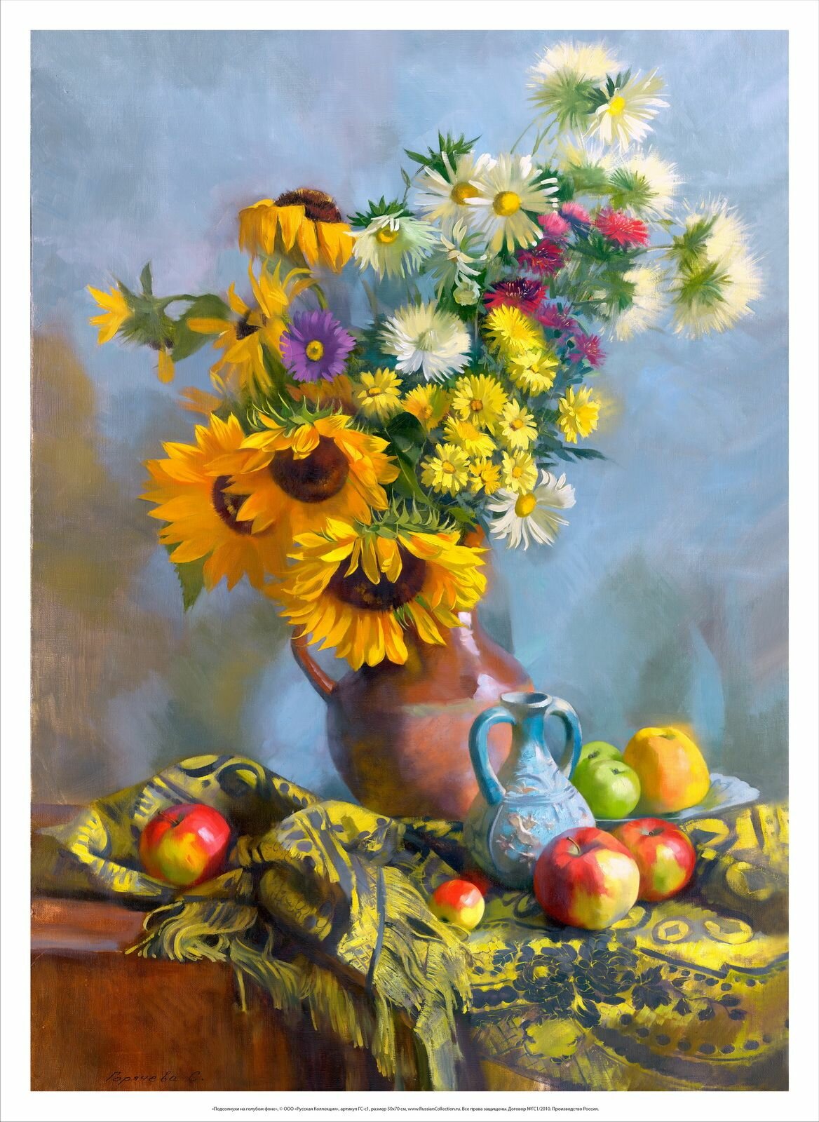 Постер на холсте, "Подсолнухи на голубом фоне", 50х70 см, художник - Горячева Светлана. Холст в рулоне, Арт. ГС-р1 информация:
