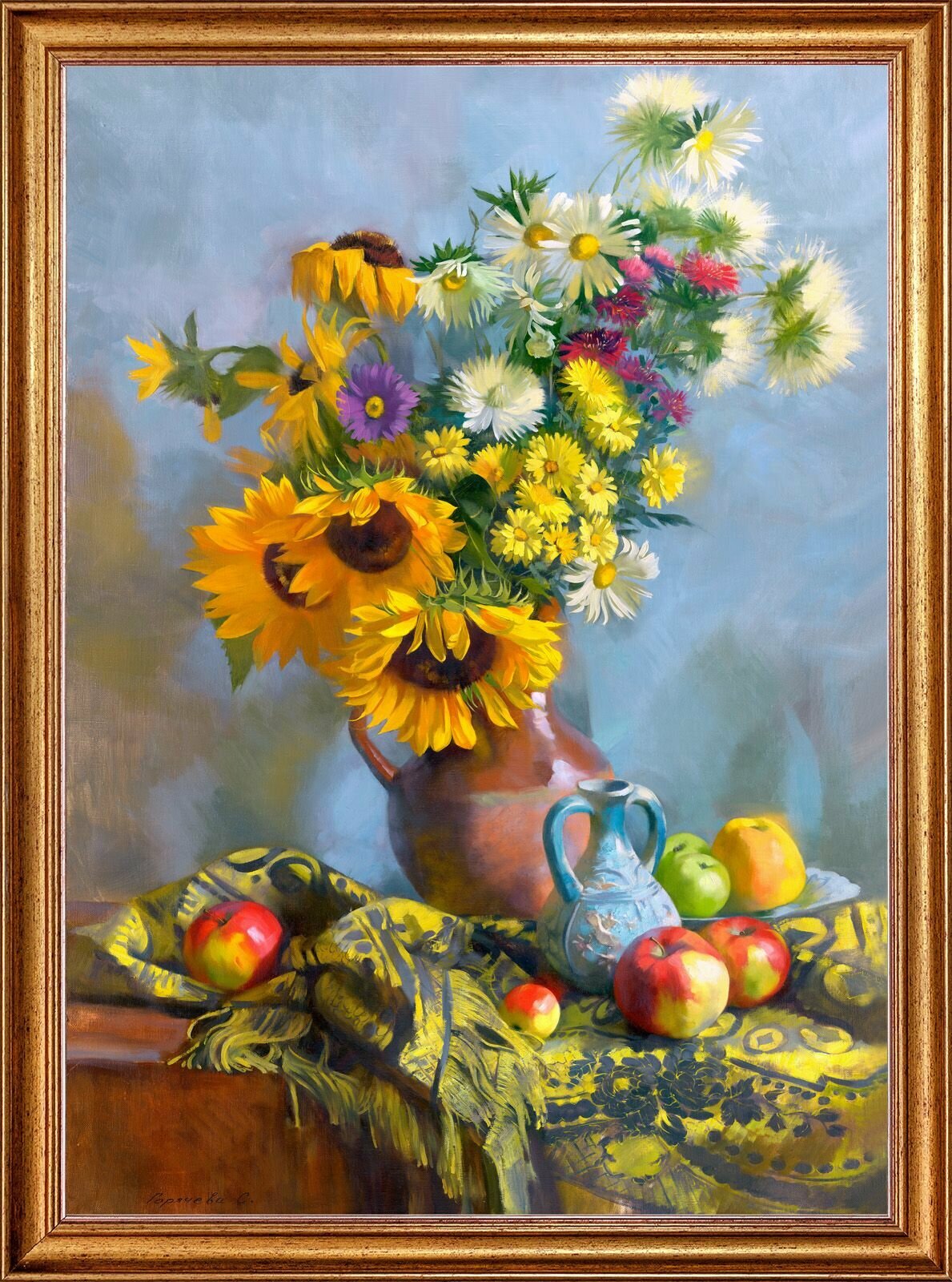 Картина на холсте, "Подсолнухи на голубом фоне", 50х70 см, художник - Горячева Светлана. Холст на деревянном подрамнике, оформлена в багет, Арт. ГС-х1 информация: