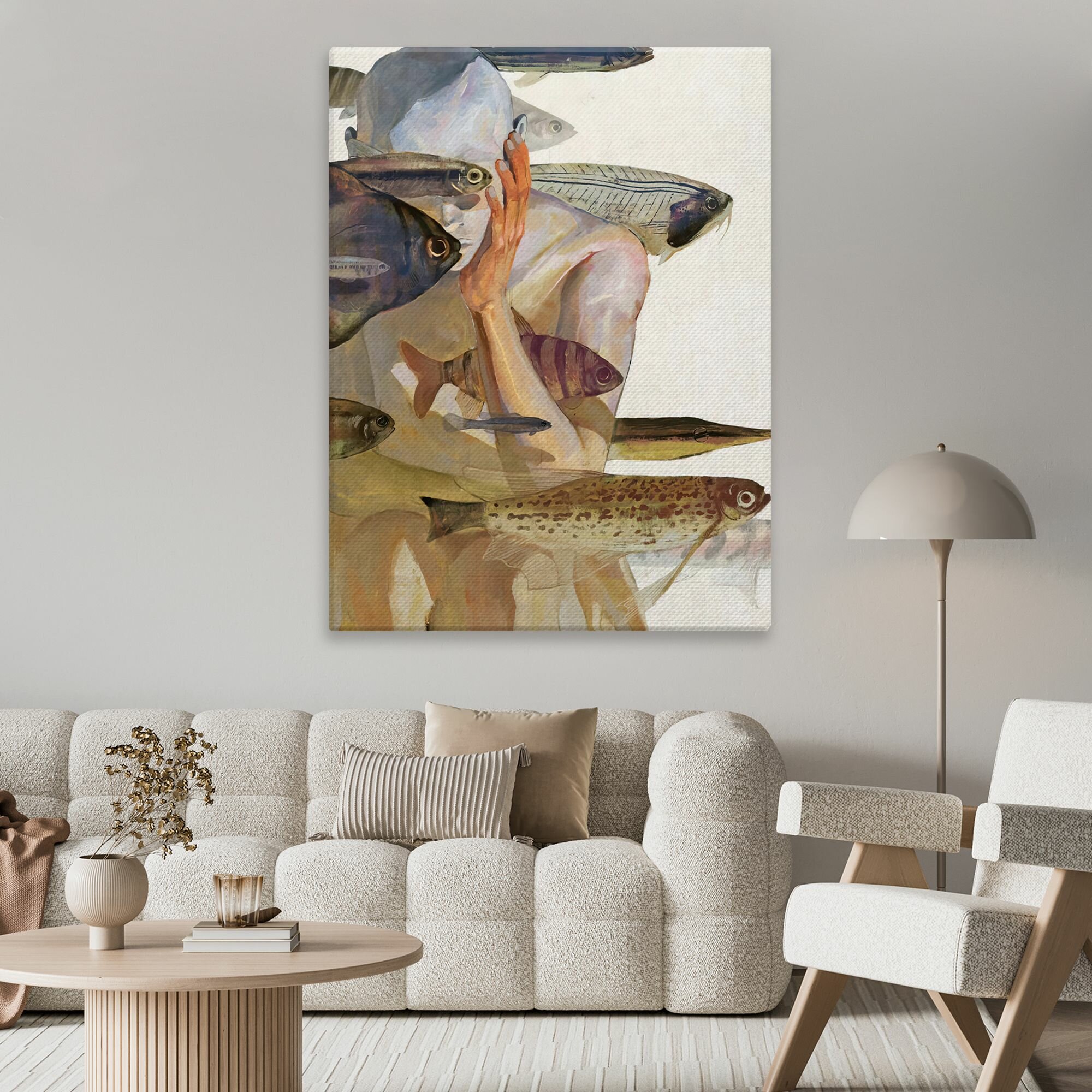 10 цен на Картина на холсте для интерьера - Силуэт человека с рыбами 30х40 см