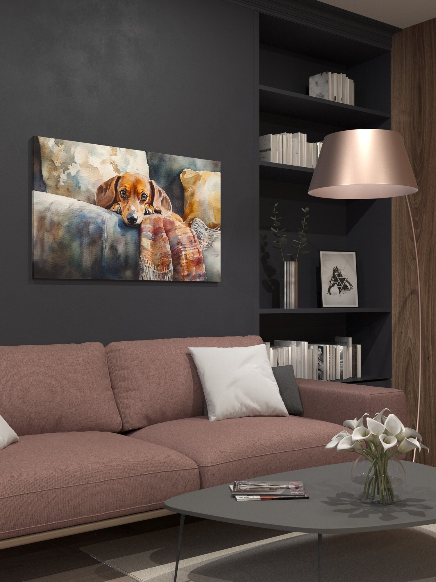 Картина на холсте интерьерная 100х60 см, акварель, такса, глаза, гостиная, уют, тепло, дружеское расположение информация:
