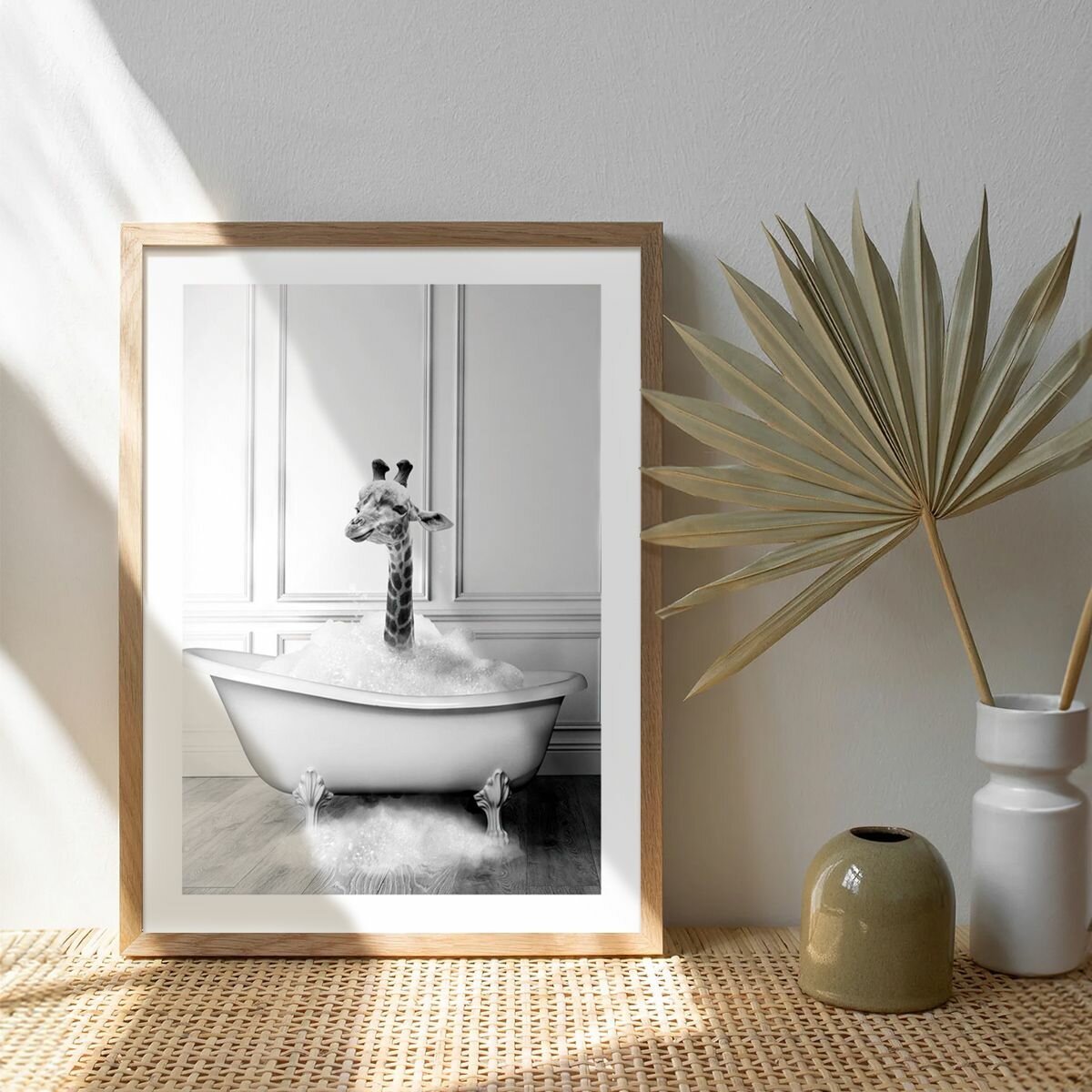 10 цен на Постер 50х70 без рамки "Жираф портрет в ванной" для интерьера
