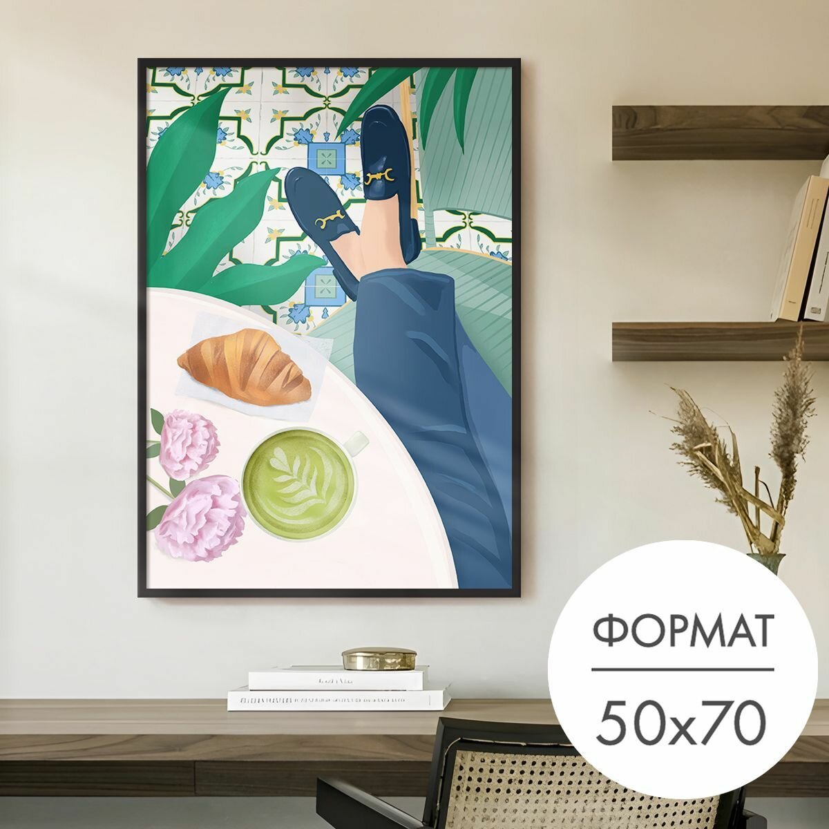 Постер "Круассан и кофе матча" 50x70 без рамки на стену для интерьера информация: