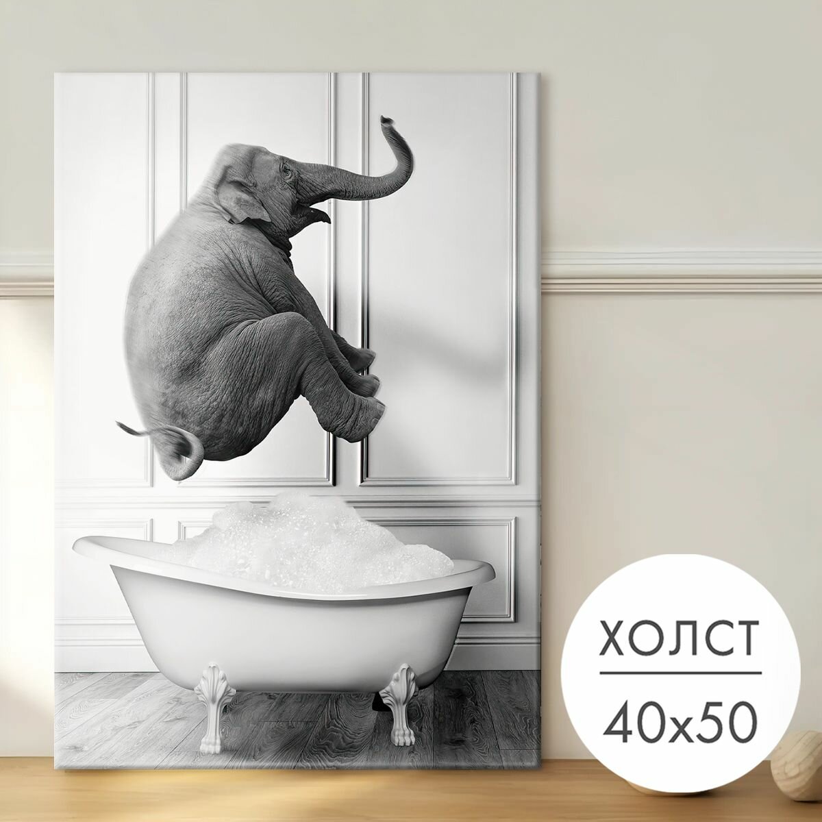 Картина на холсте "Слон в ванной" 40x50 на стену для интерьера информация: