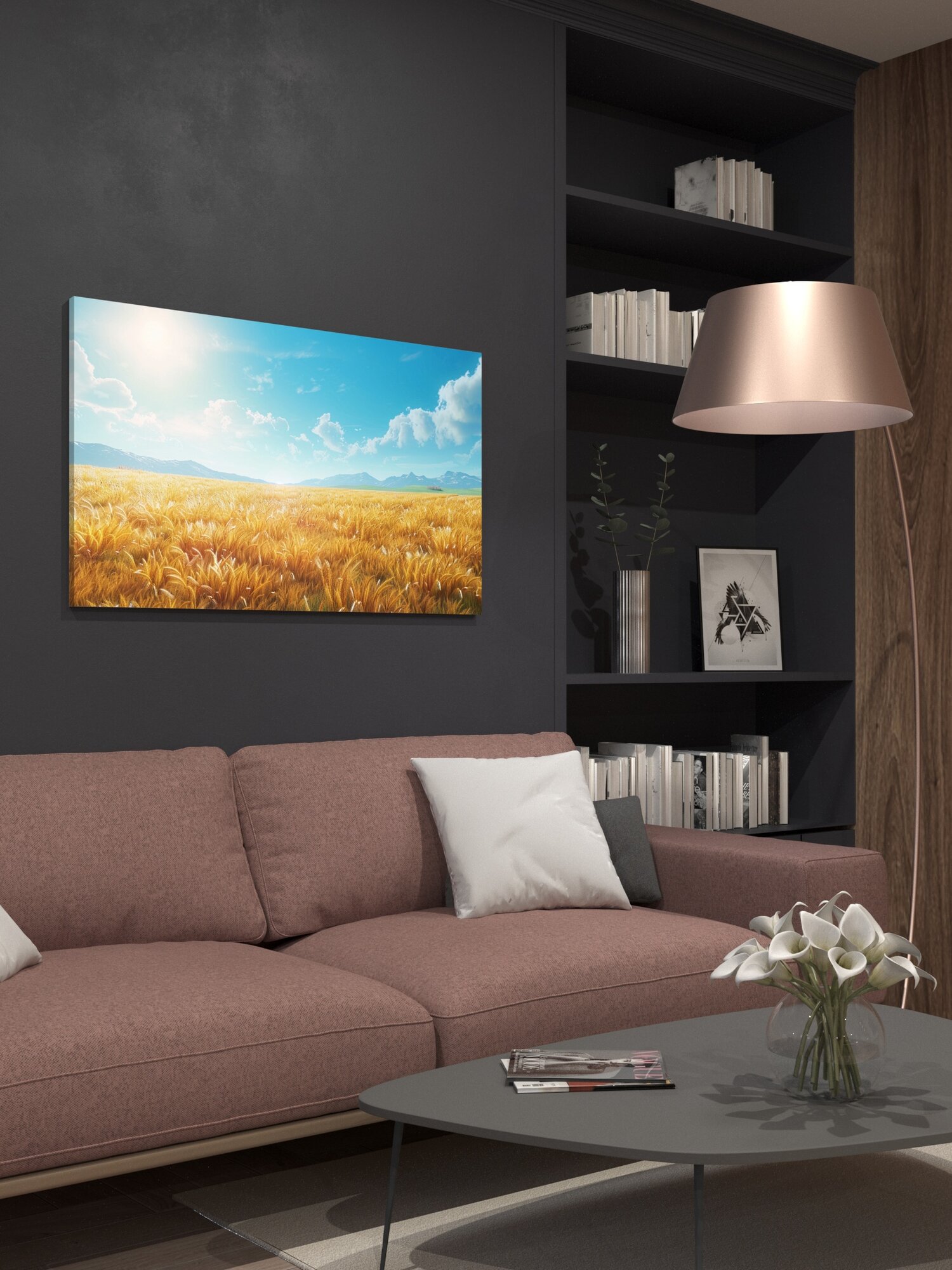 Отзывы на Картина на холсте интерьерная 100х60 см, пейзаж, лето, солнце, пшеница, поле, горы, небо, разрешение, живописный