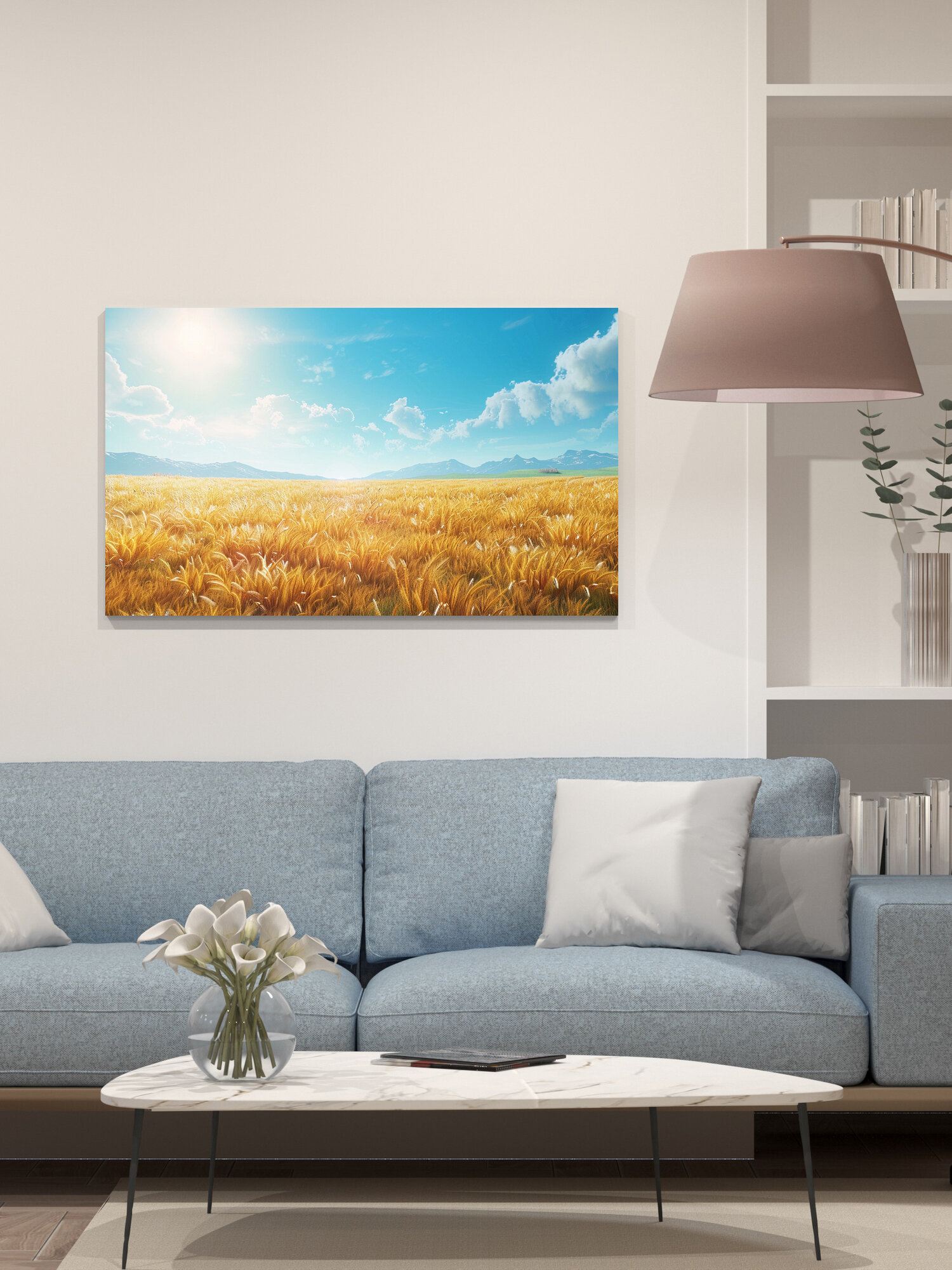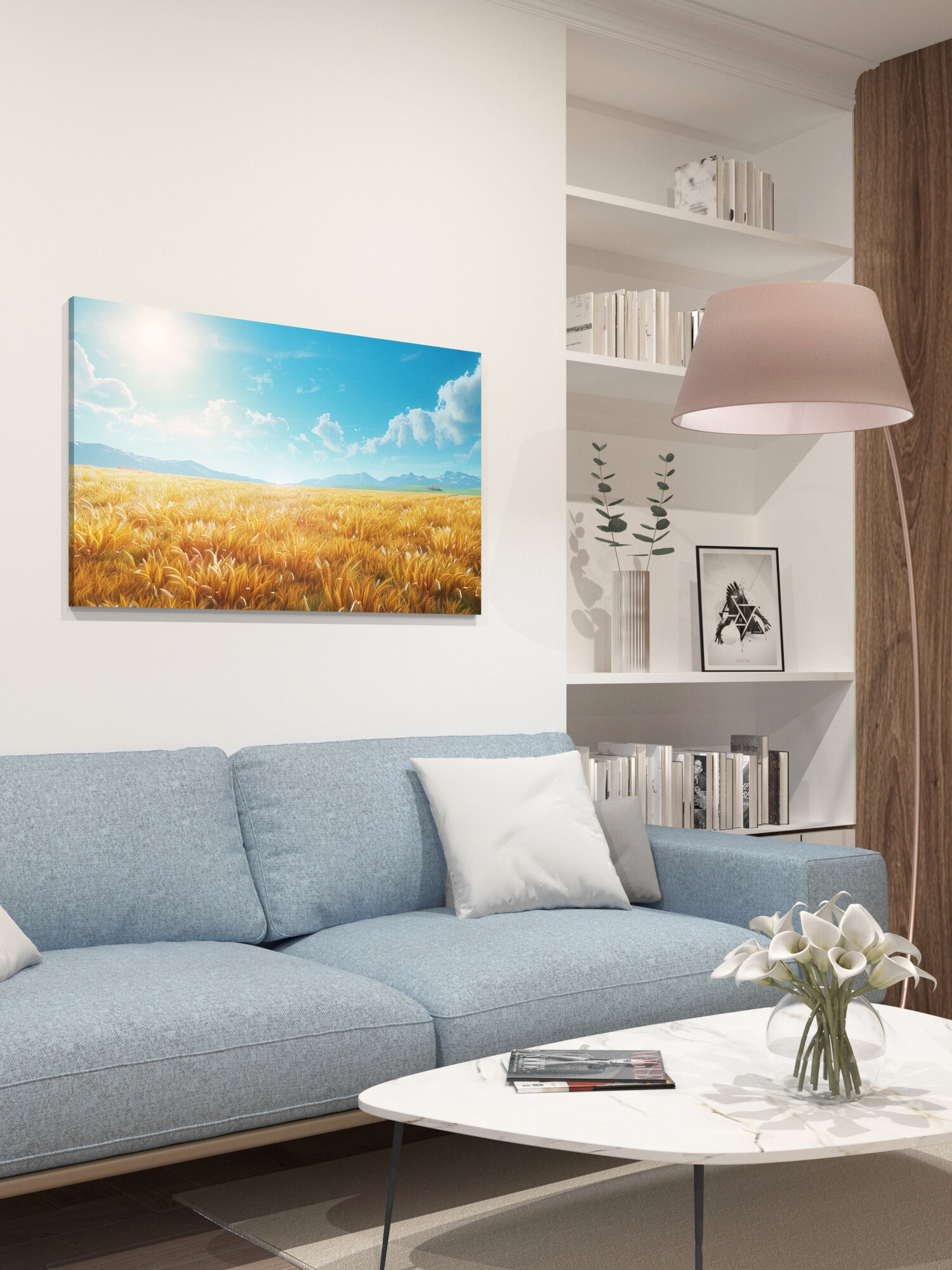 Картина на холсте интерьерная 100х60 см, пейзаж, лето, солнце, пшеница, поле, горы, небо, разрешение, живописный информация: