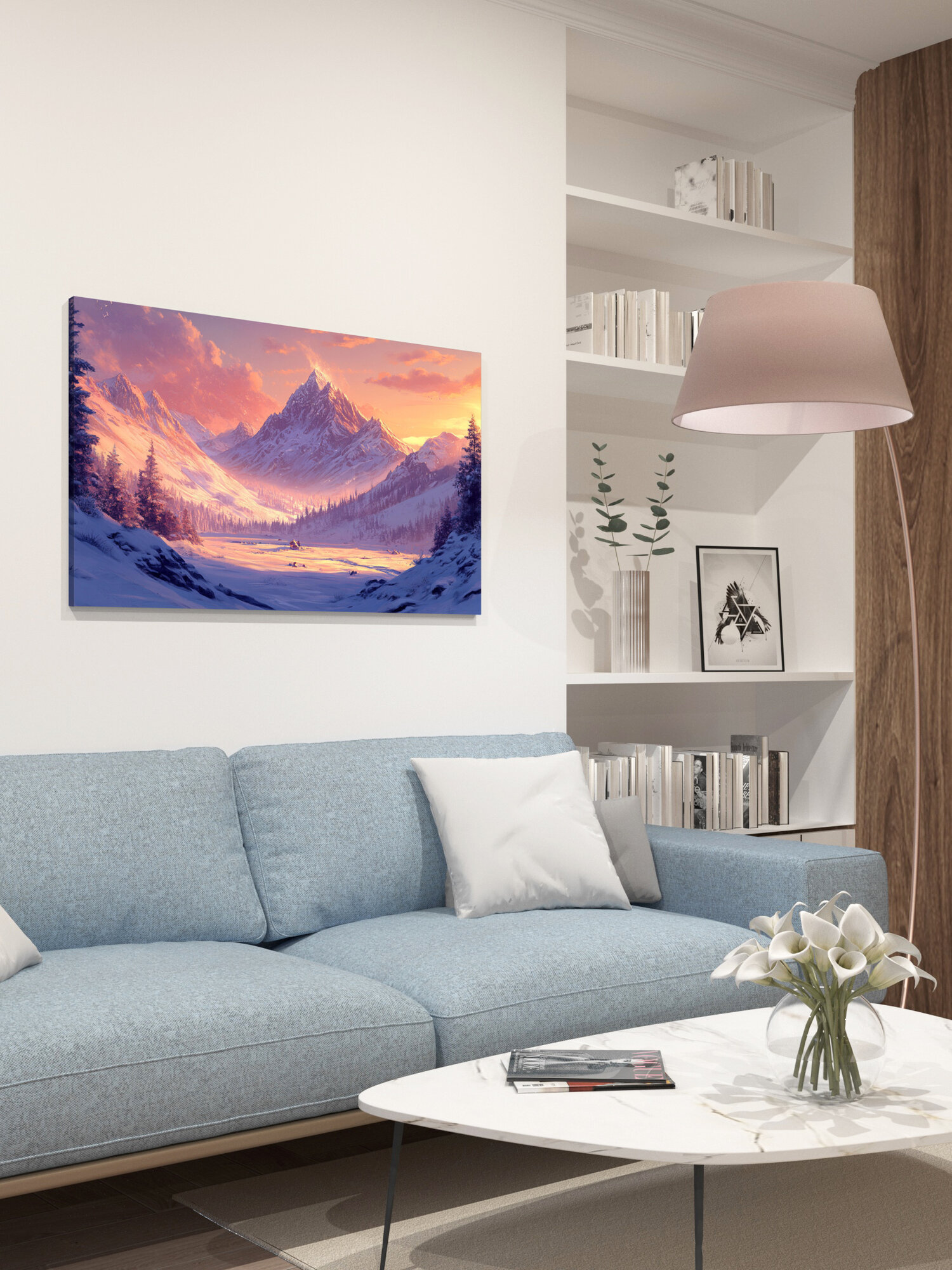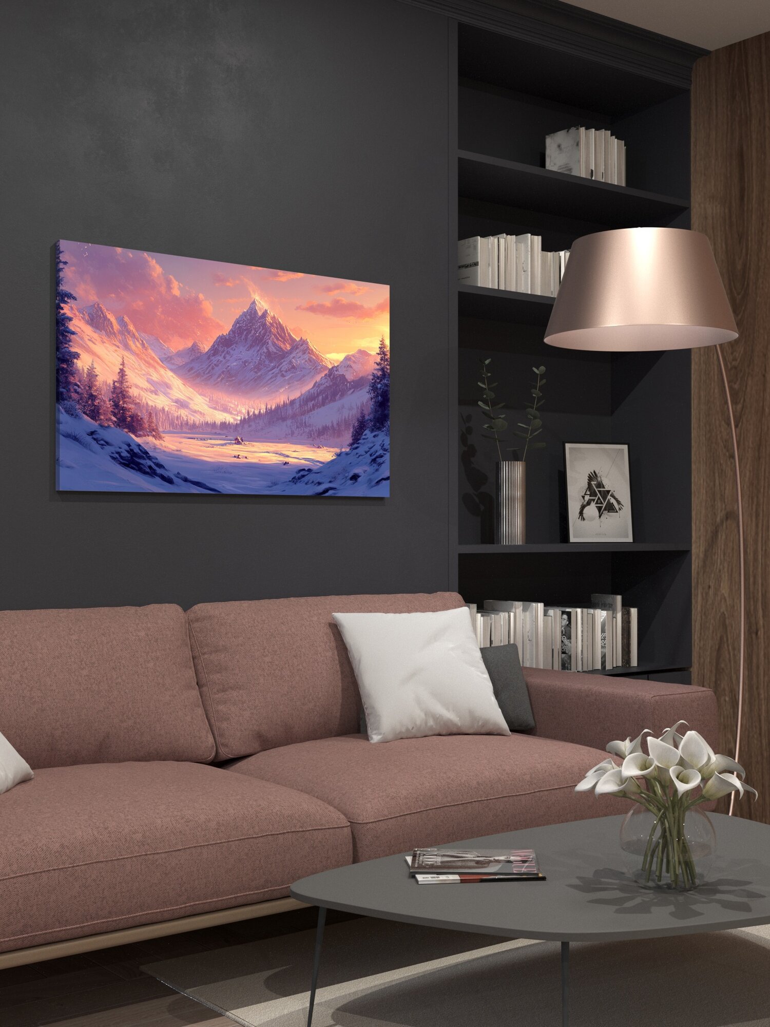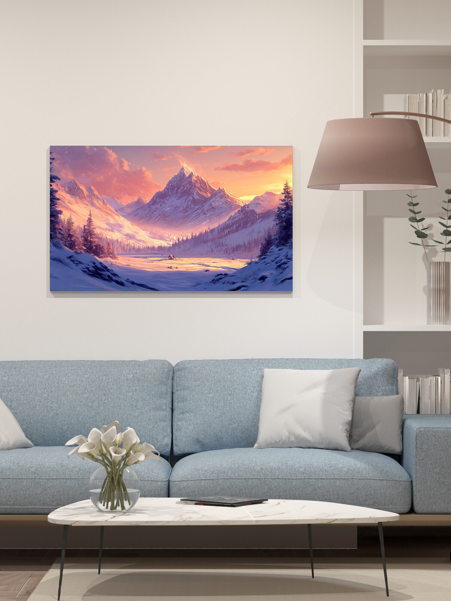Отзывы на Картина на холсте интерьерная 100х60 см, заснеженная долина, величественный горный хре, сумерки, закат, сияние солнца