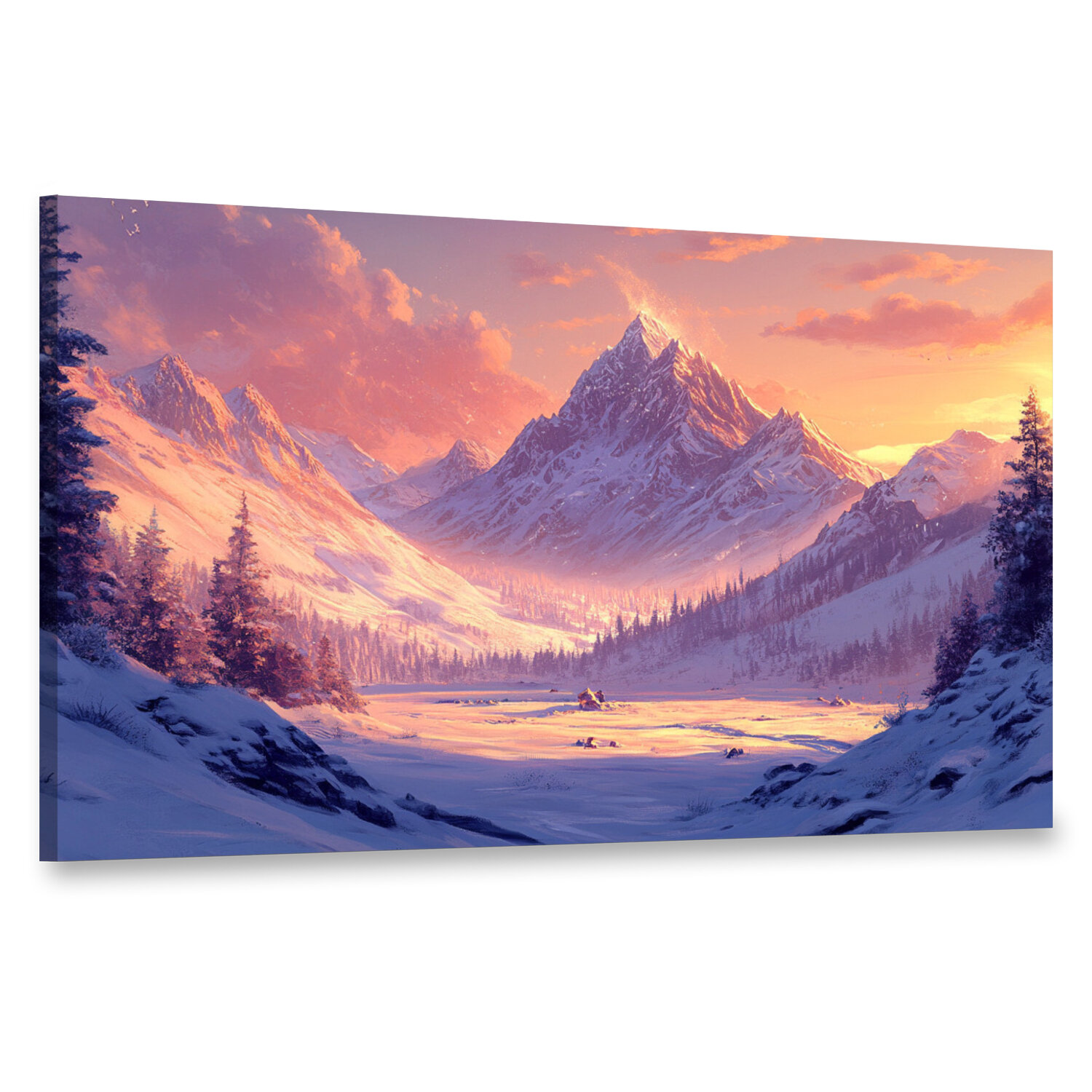 10 цен на Картина на холсте интерьерная 100х60 см, заснеженная долина, величественный горный хре, сумерки, закат, сияние солнца