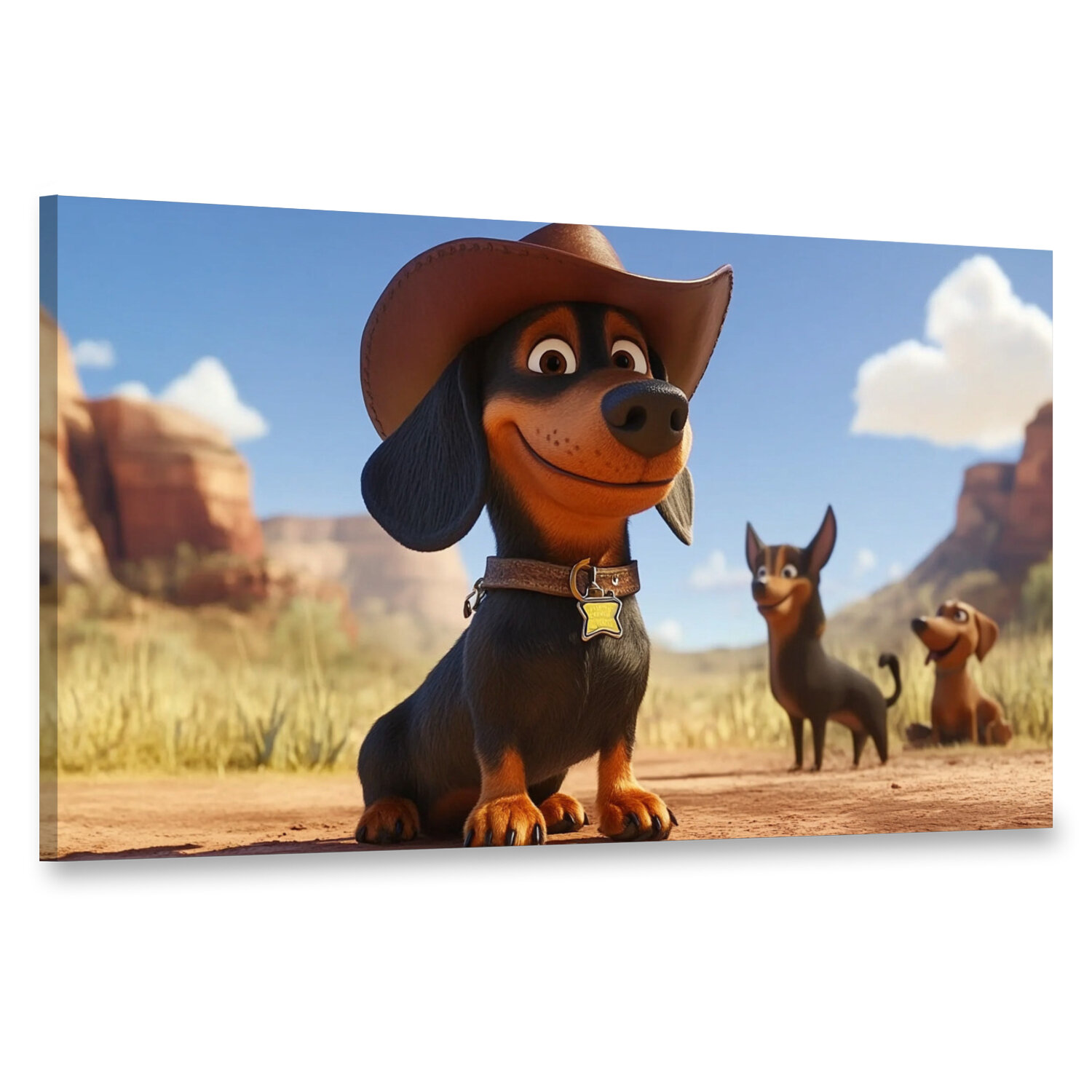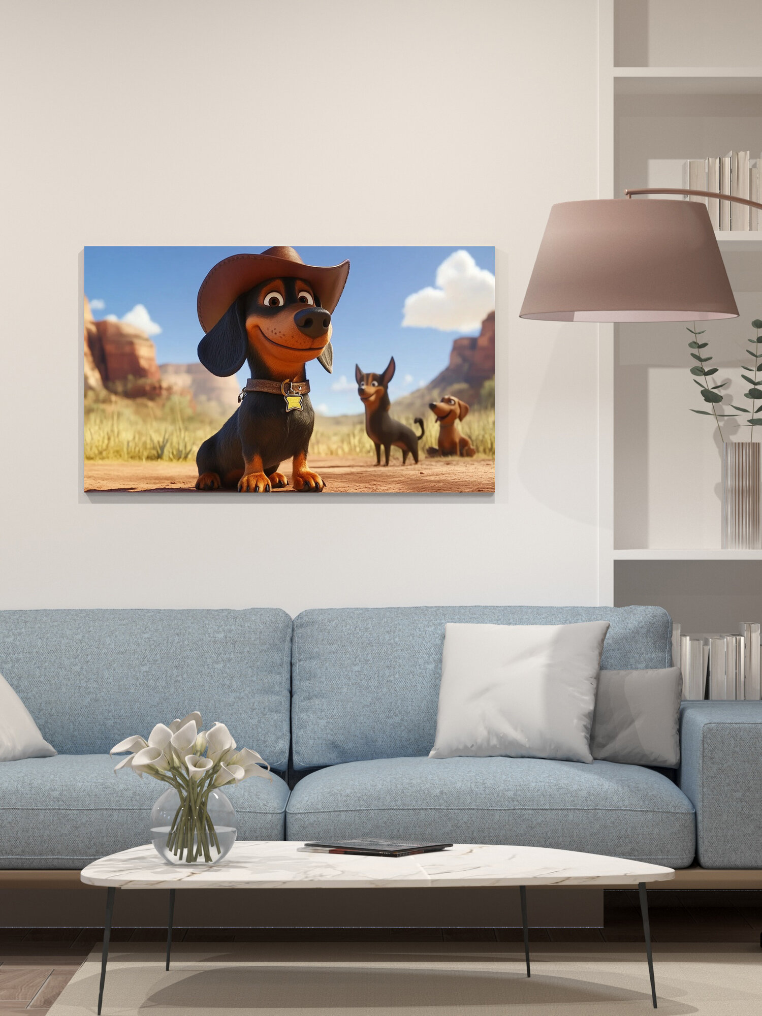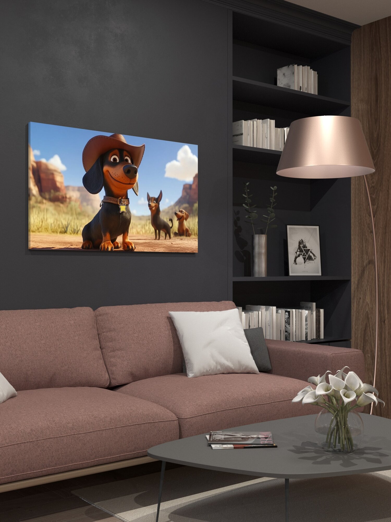Отзывы на Картина на холсте интерьерная 100х60 см, анимация, Disney, Pixar, такса, ковбойская шляпа, прерия, солнце, приключения