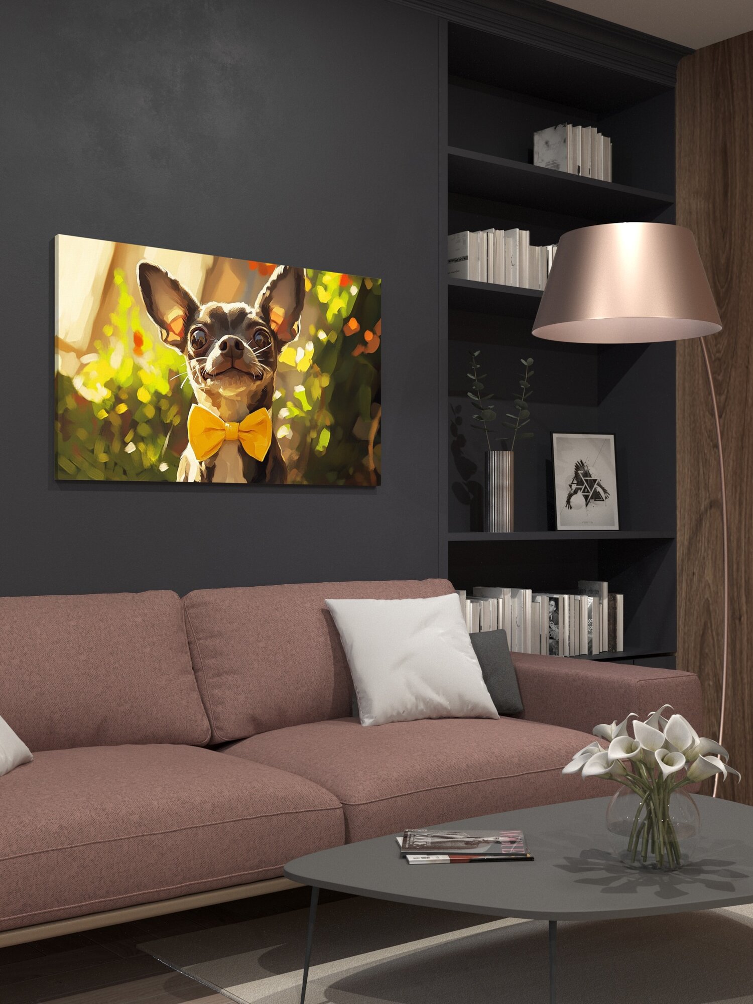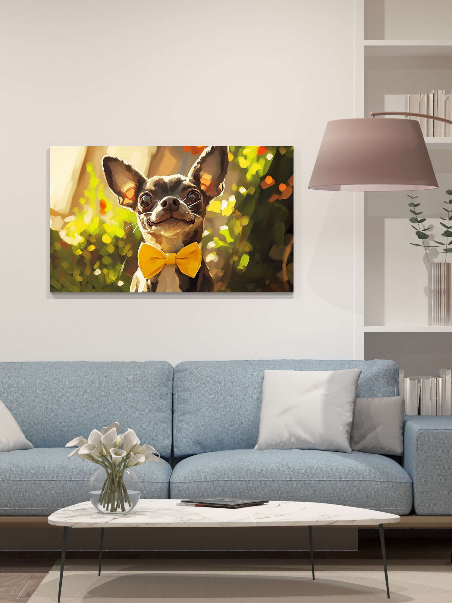 10 цен на Картина на холсте интерьерная 100х60 см, чихуахуа, галстук-бабочка, желтый, сад, солнце, радость, игривое, изобилие