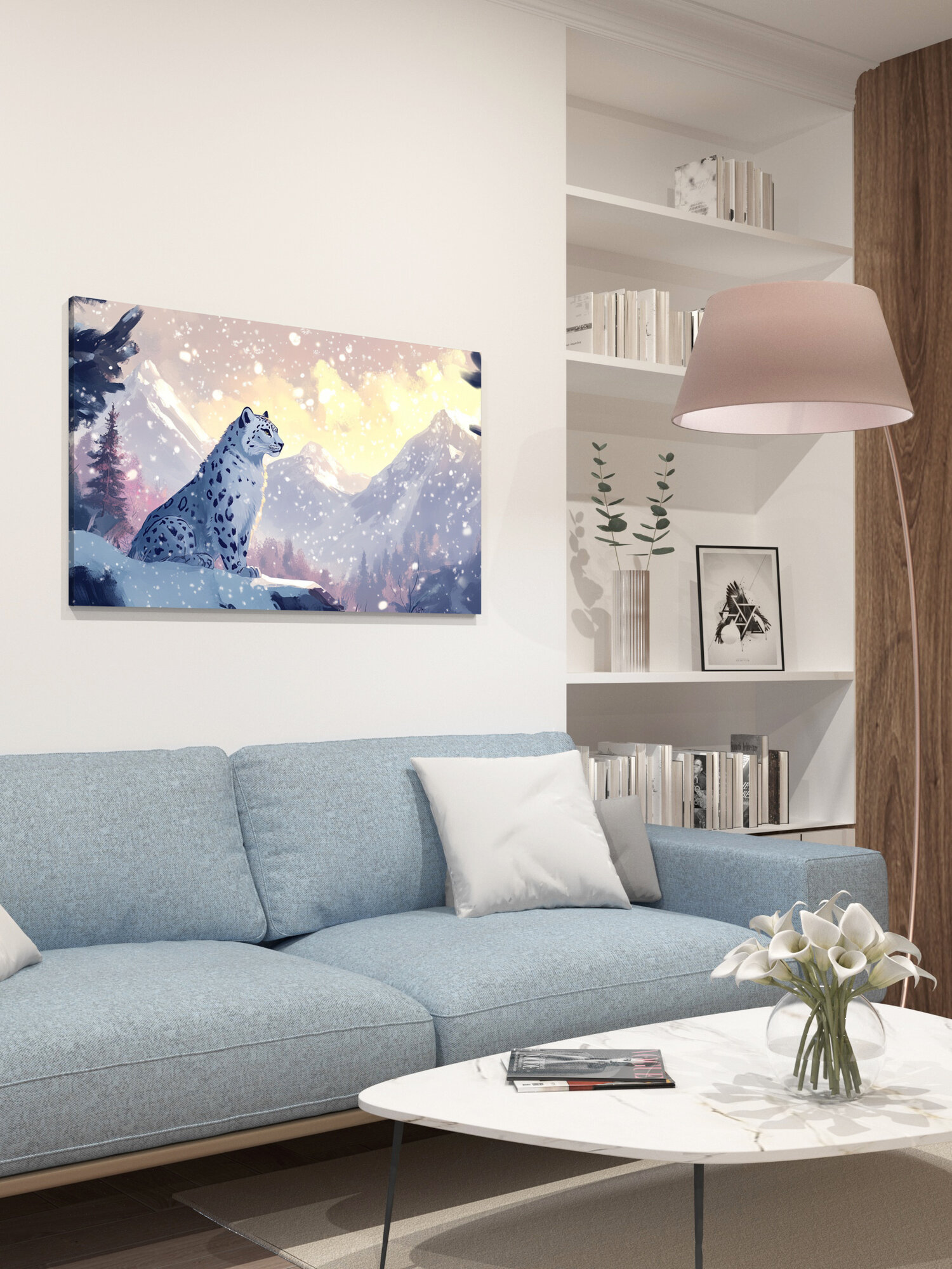Отзывы на Картина на холсте интерьерная 100х60 см, Снежный барс, горы, снег, зимний пейзаж, мех, снежинки, величественный