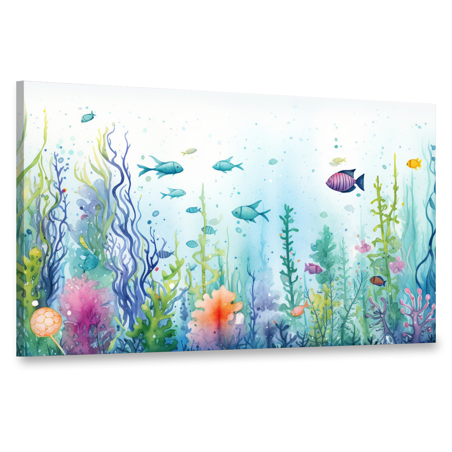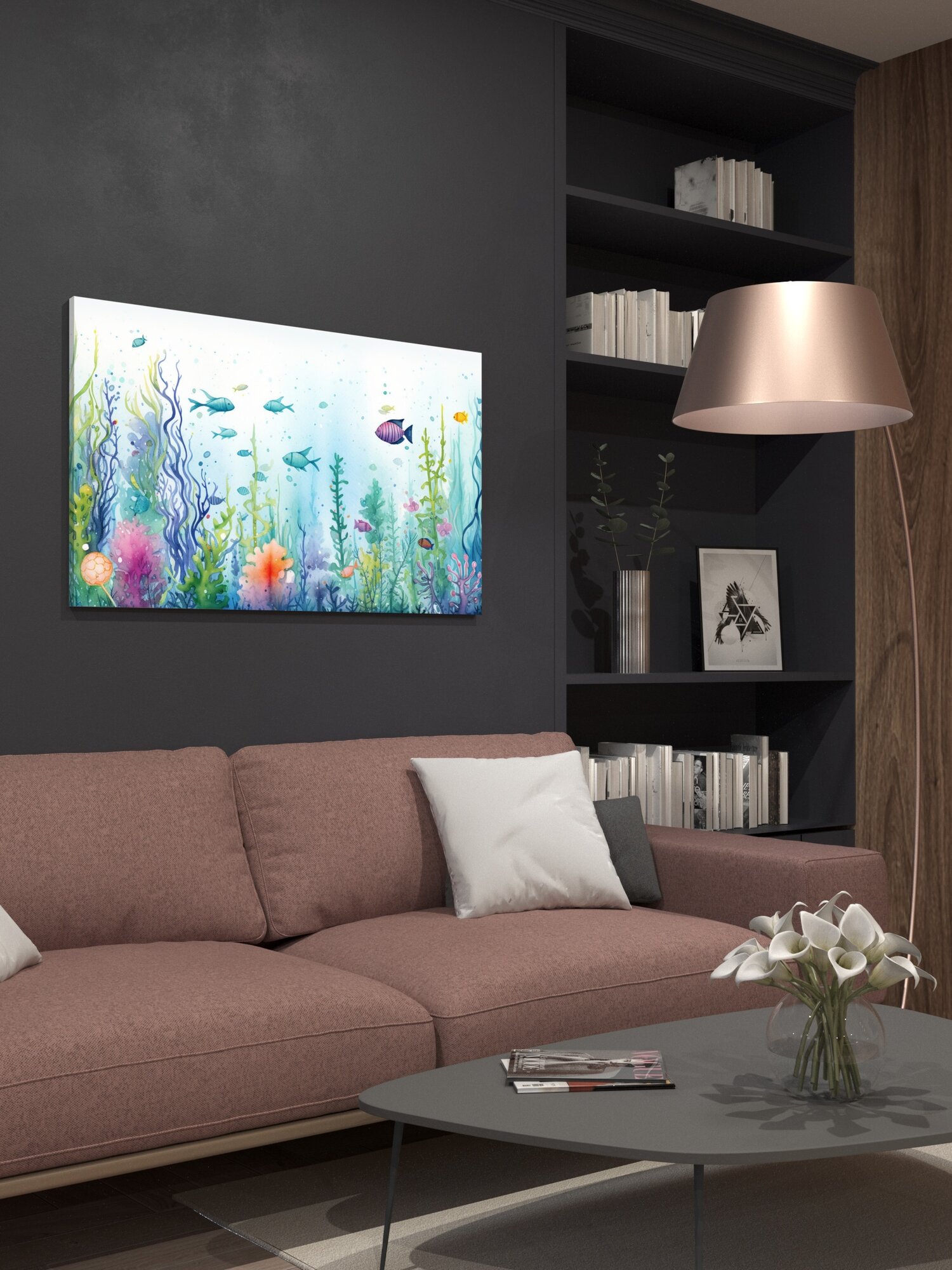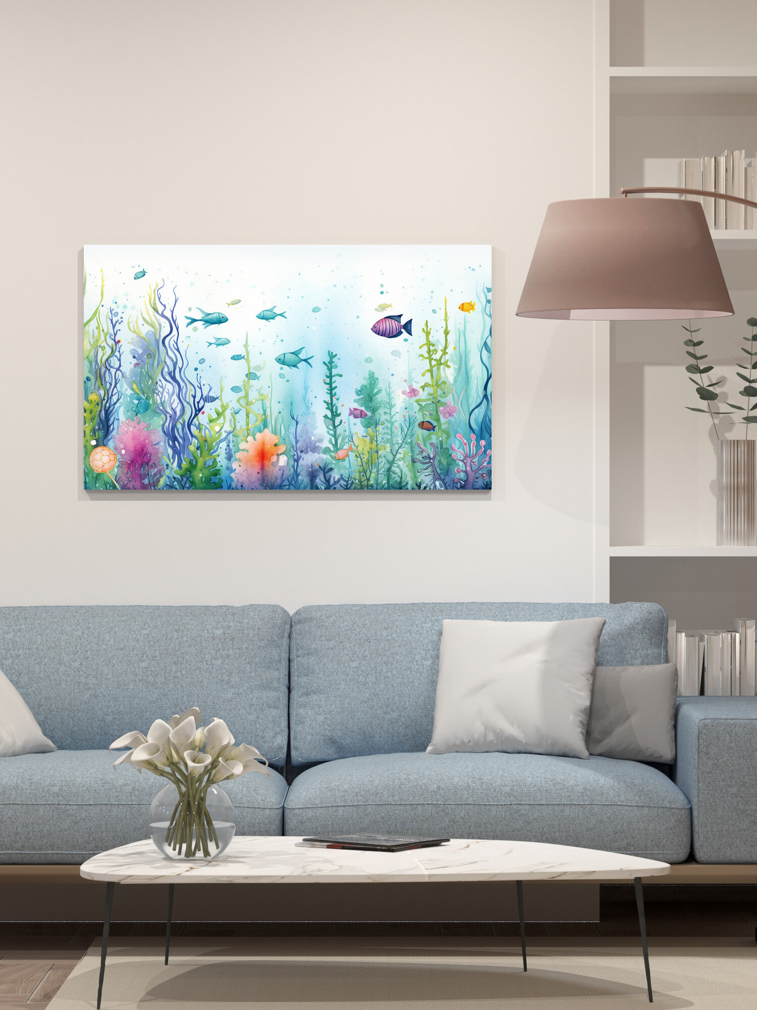 10 цен на Картина на холсте интерьерная 100х60 см, акварельная иллюстрация, "Водный мир", подводная сцена, морские существа