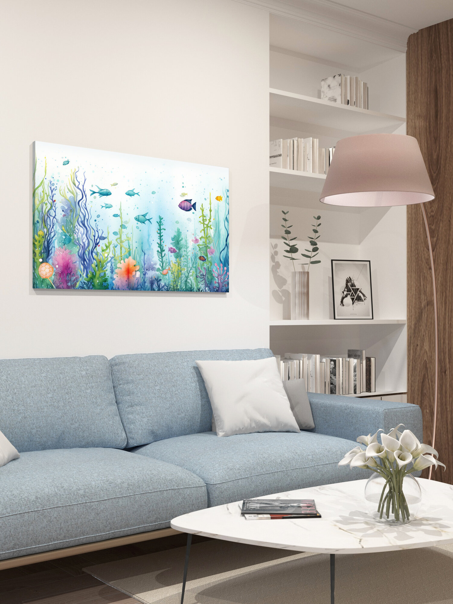 Картина на холсте интерьерная 100х60 см, акварельная иллюстрация, "Водный мир", подводная сцена, морские существа информация: