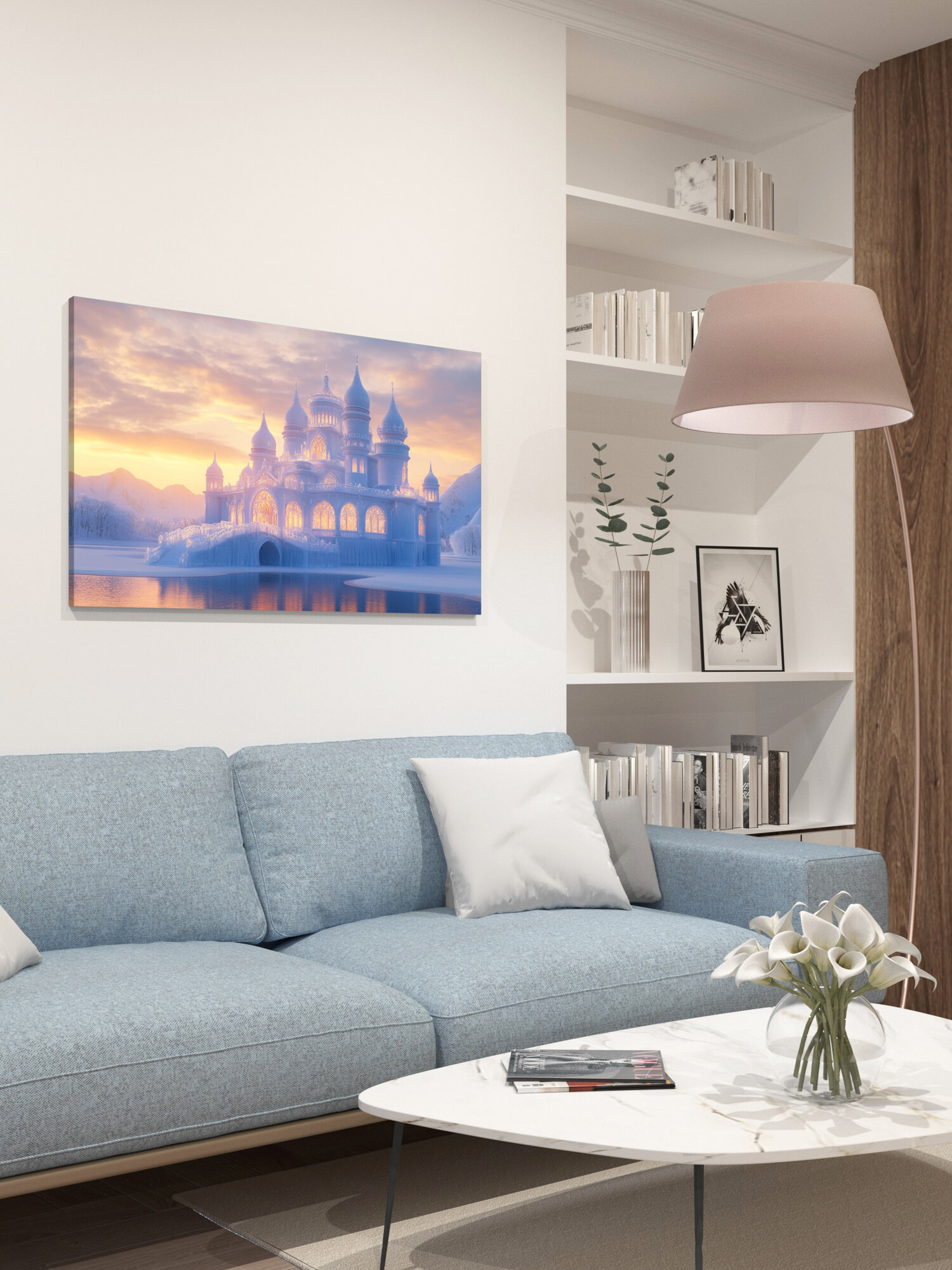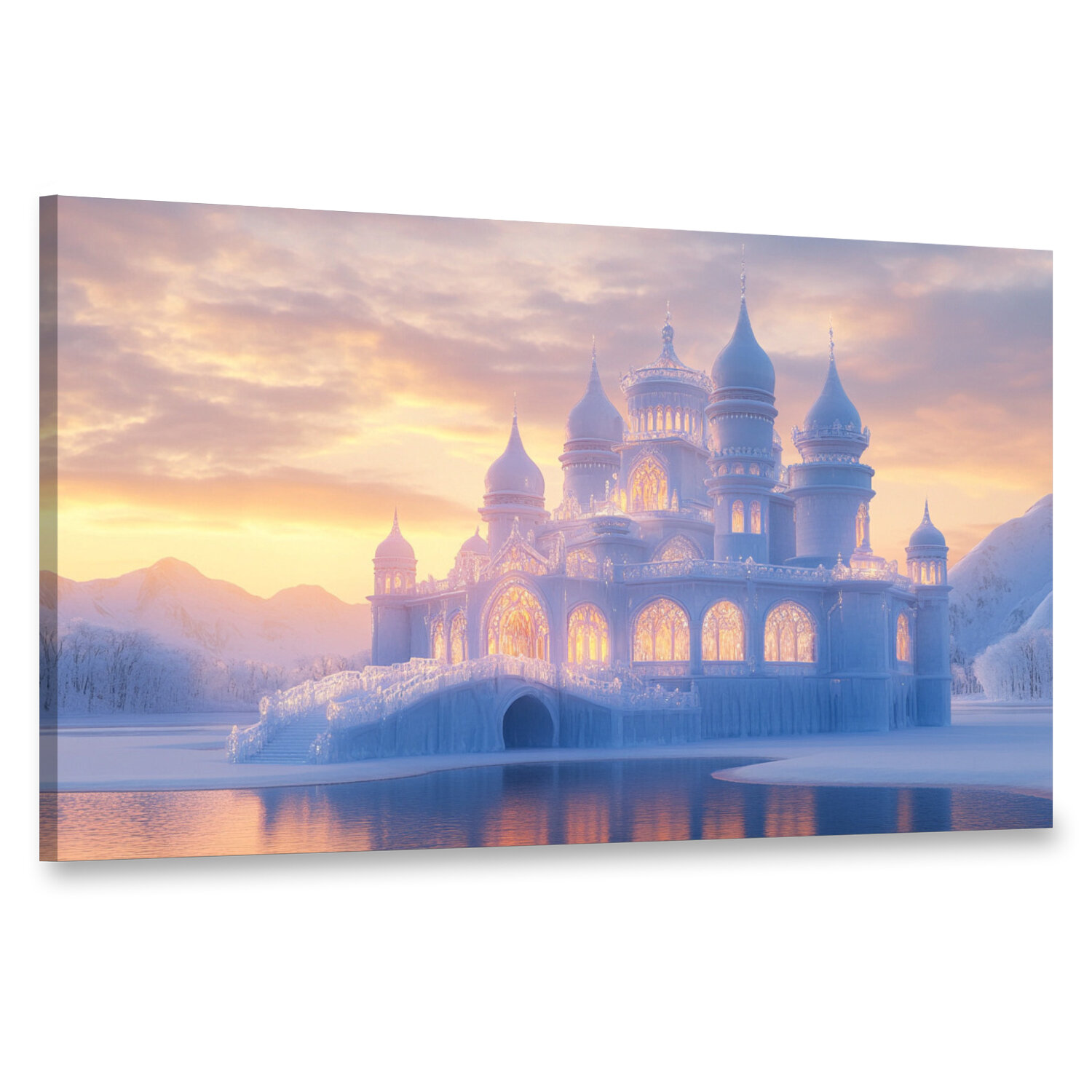 Отзывы на Картина на холсте интерьерная 100х60 см, Ледяной дворец, Снежная королева, сумерки, заходящее солнце, золотистый свет