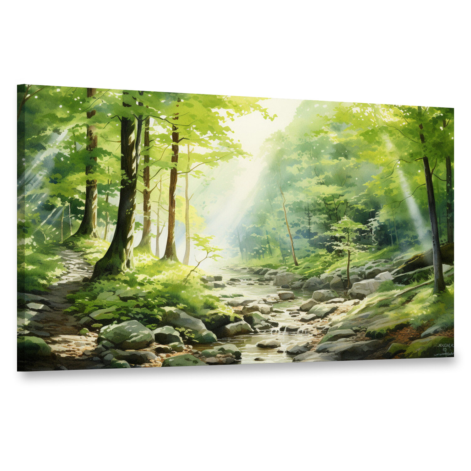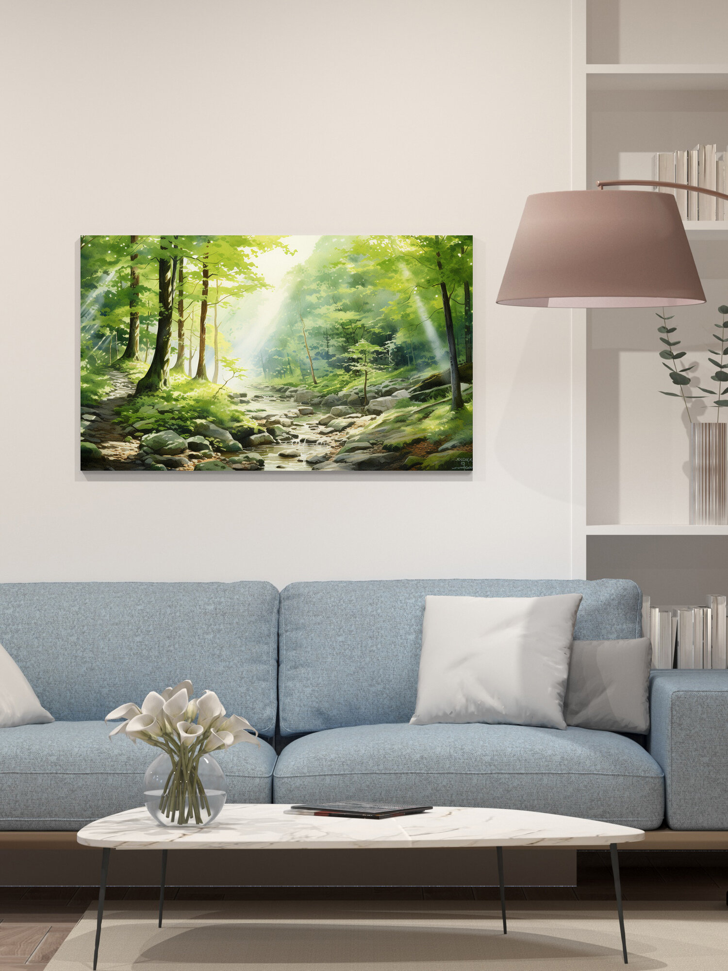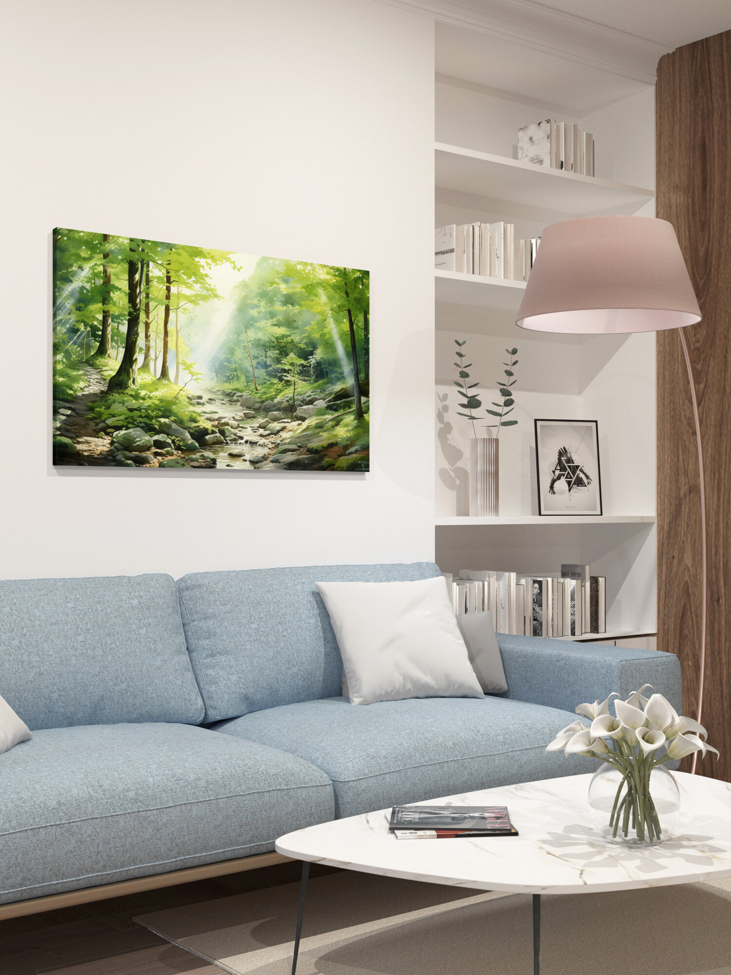 10 цен на Картина на холсте интерьерная 100х60 см, пышный лес, лучи солнца, проникающие сквозь деревь, спокойная энергия