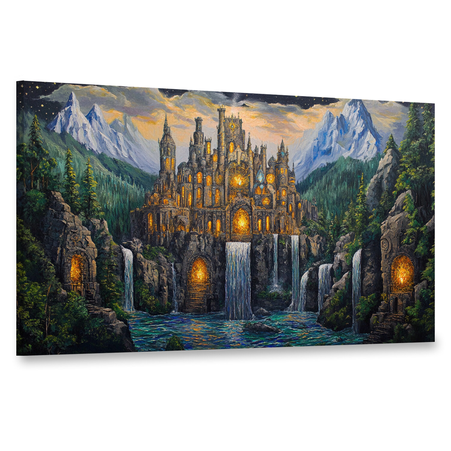 10 цен на Картина на холсте интерьерная 100х60 см, гномы, цитадель, горный хребет, водопады, зелень, каменные големы, кристаллы