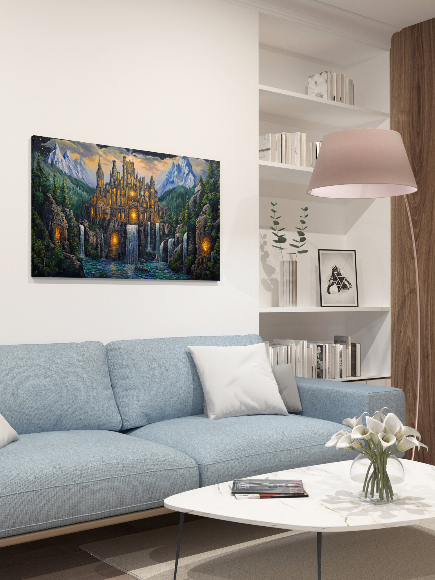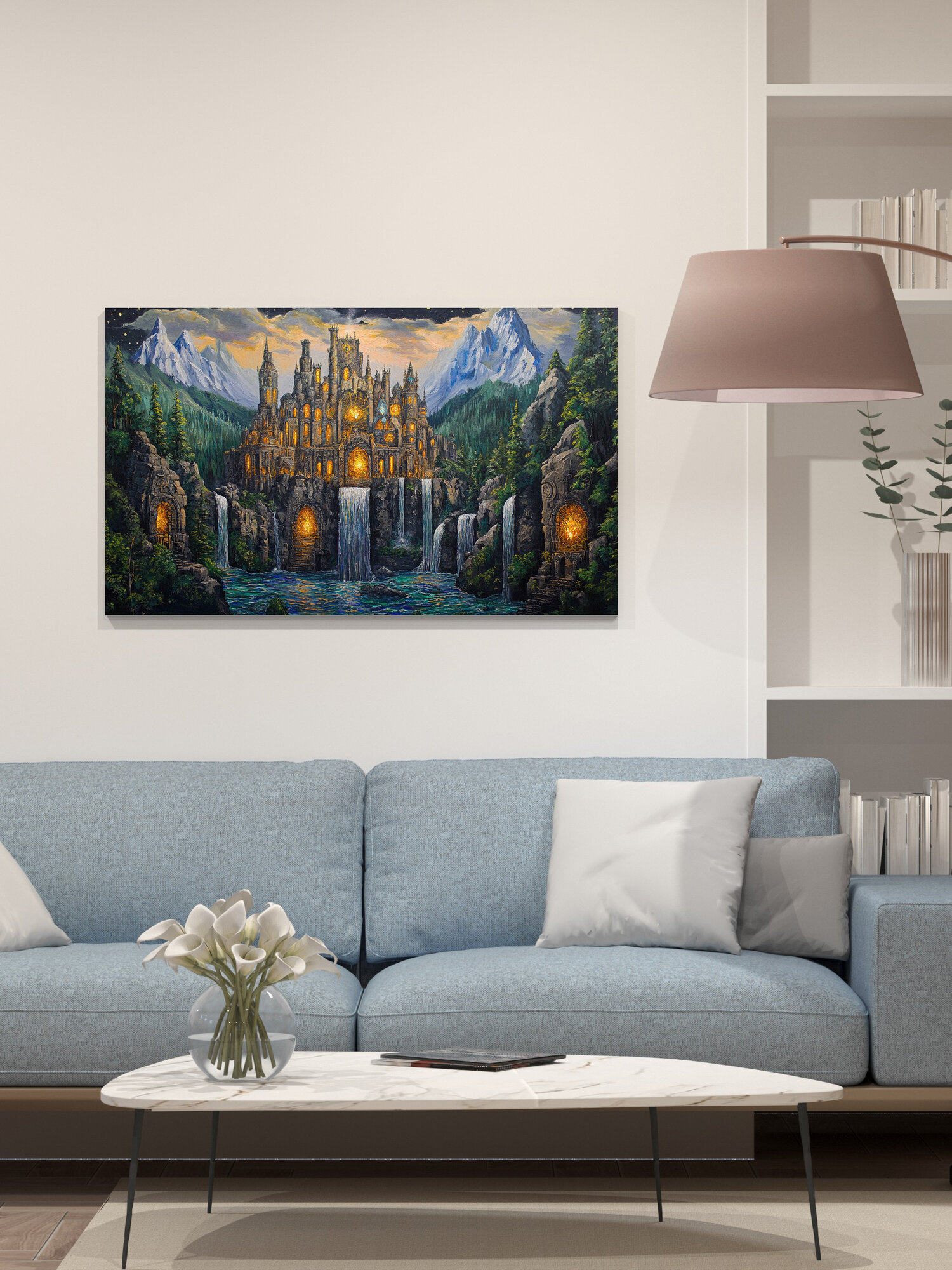 Отзывы на Картина на холсте интерьерная 100х60 см, гномы, цитадель, горный хребет, водопады, зелень, каменные големы, кристаллы