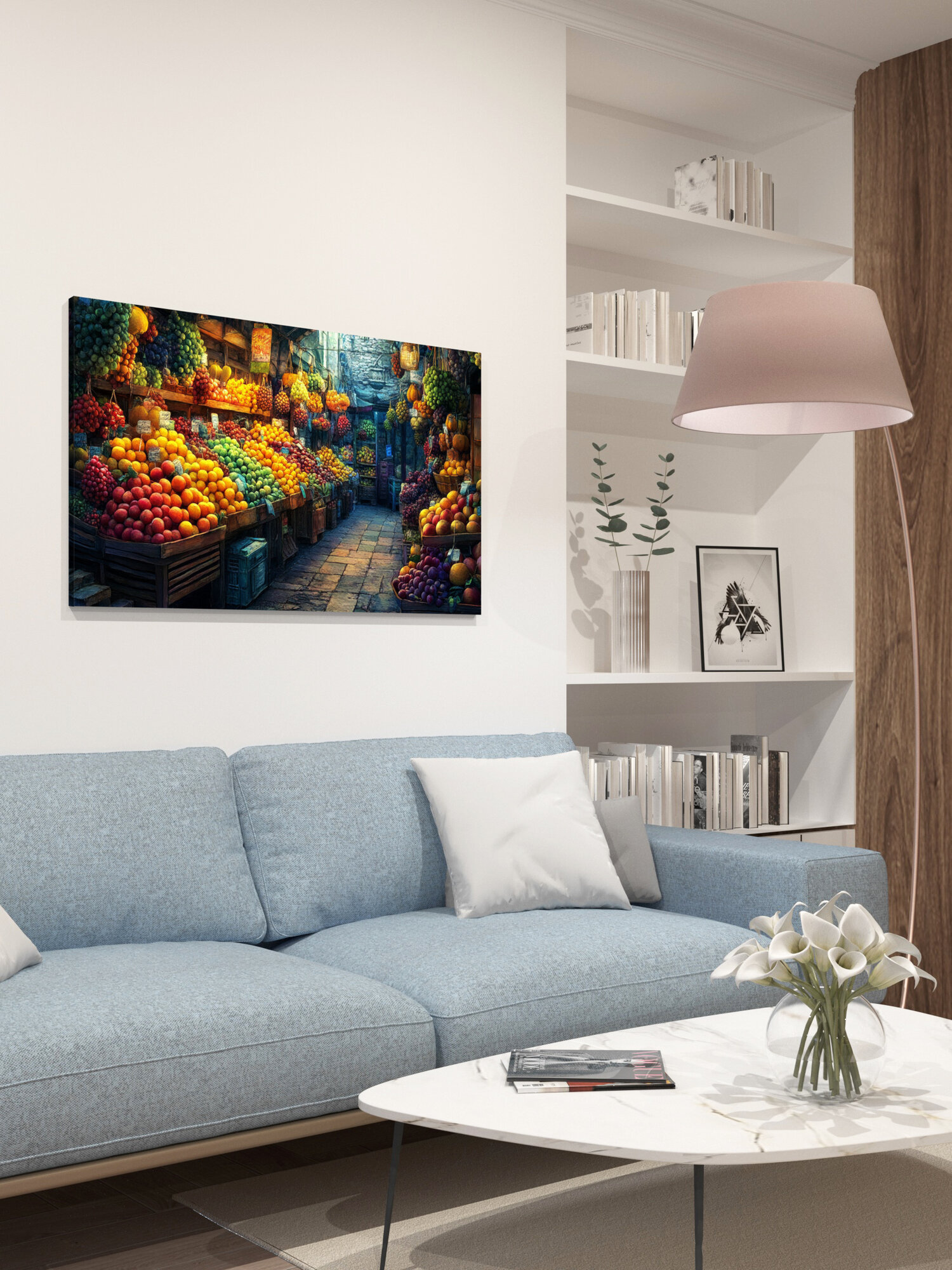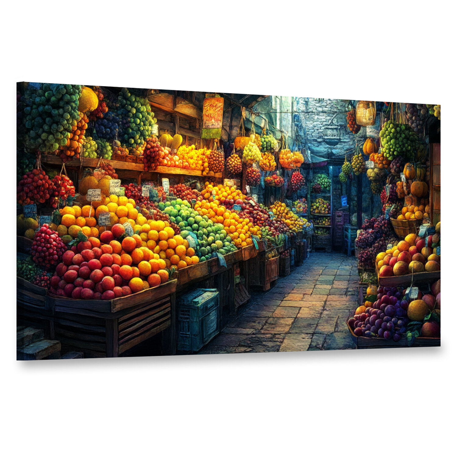 10 цен на Картина на холсте интерьерная 100х60 см, фруктовый рынок, сочные фрукты, спелые фрукты, калейдоскоп цветов