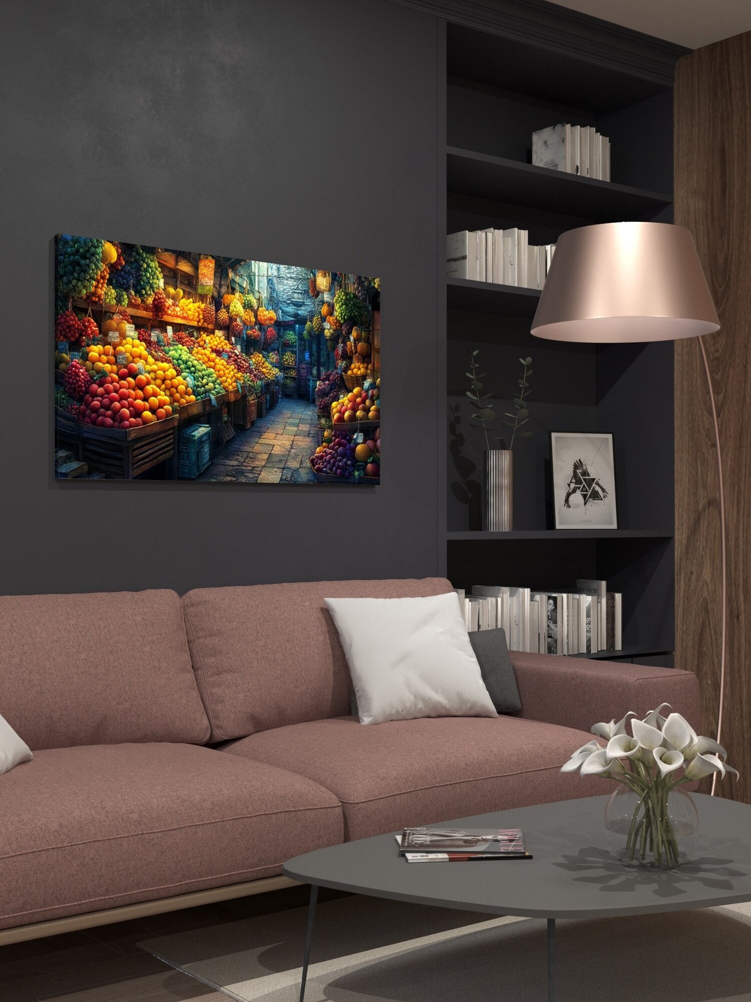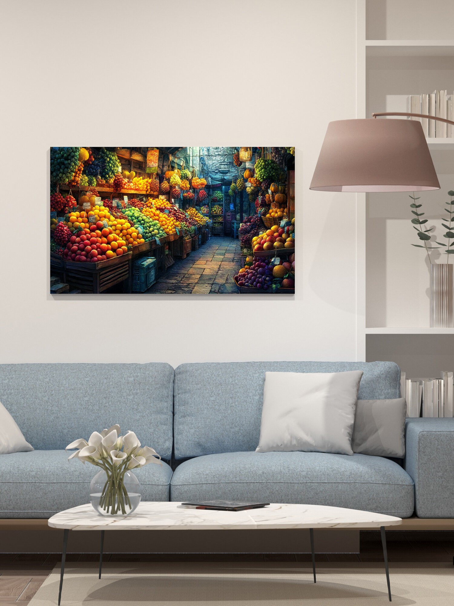 Картина на холсте интерьерная 100х60 см, фруктовый рынок, сочные фрукты, спелые фрукты, калейдоскоп цветов информация: