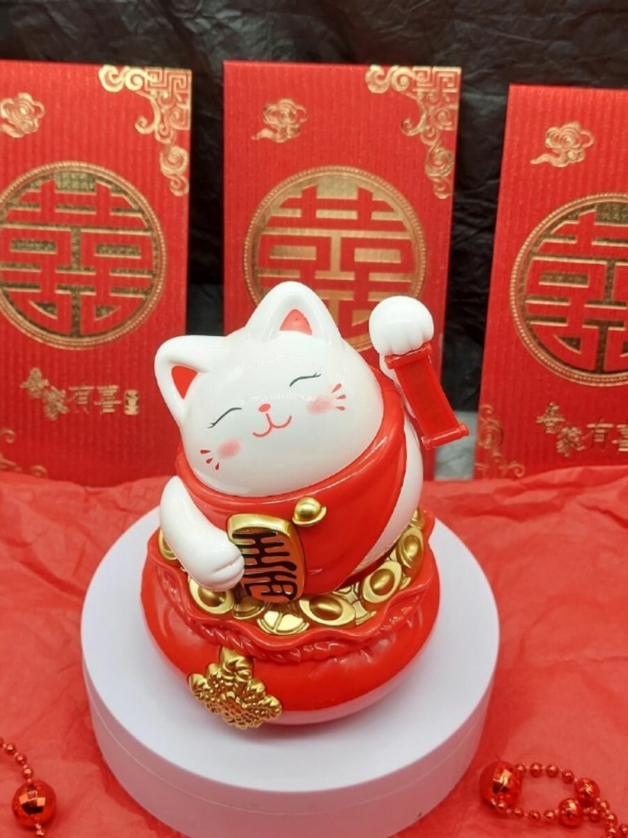 10 цен на Статуэтка денежный кот, Манэки-нэко, танцует и машет лапкой, красный