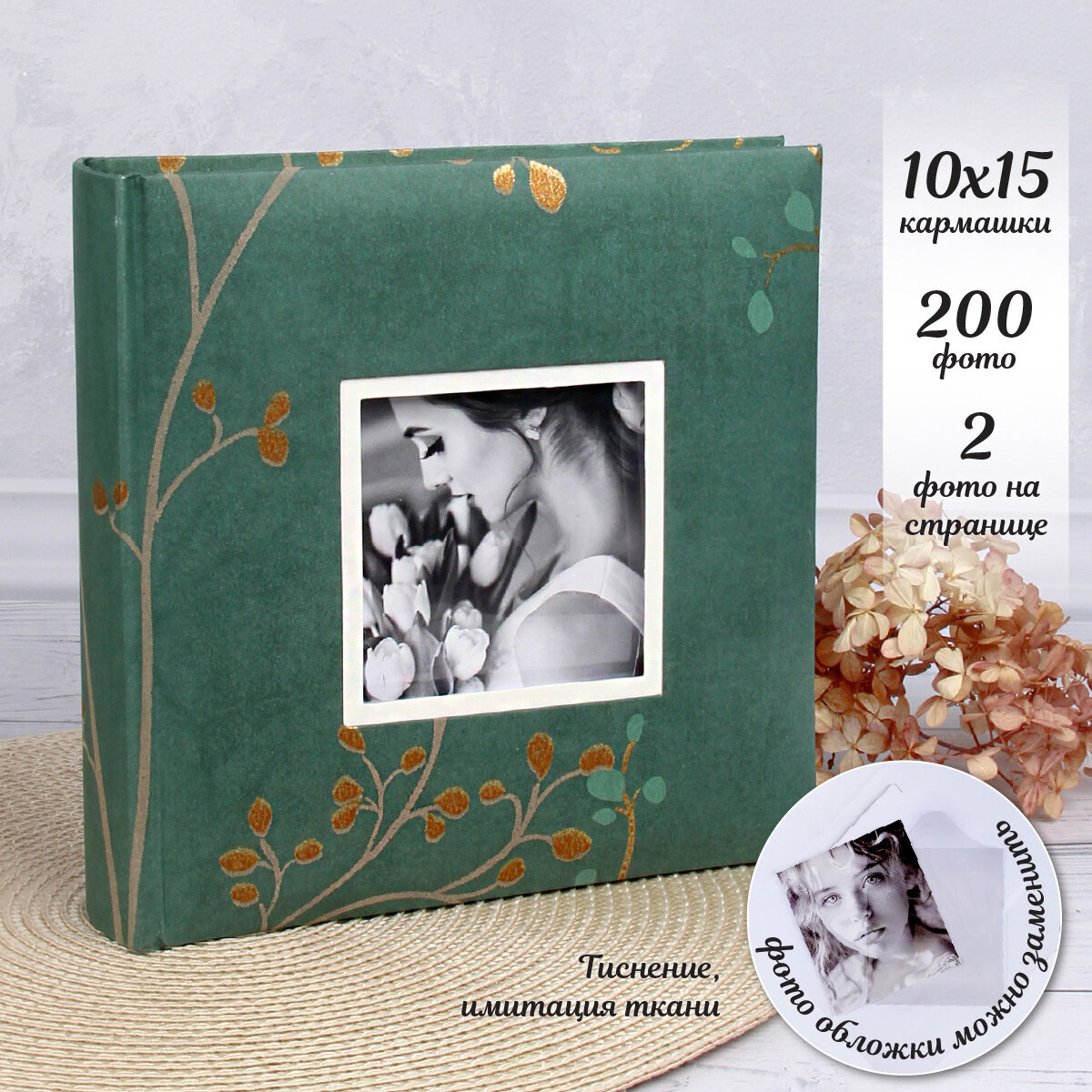 Фотоальбом из эко-кожи, двухцветный с вышивкой, 200 фото 10х15 см в кармашках