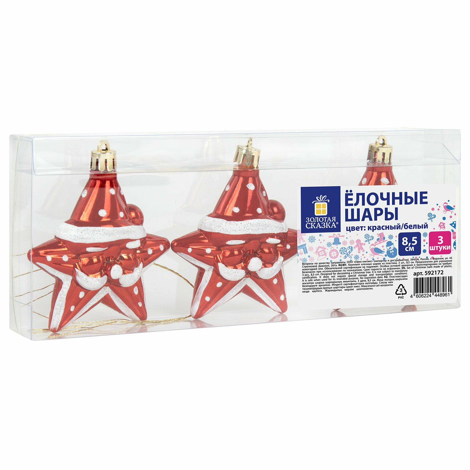 Елочные шары-игрушки (новогоднее украшение) для декора набор 3 шт, 8,5 см Звезды с усами, красный / белый, пластик, Золотая Сказка, 592172 информация:
