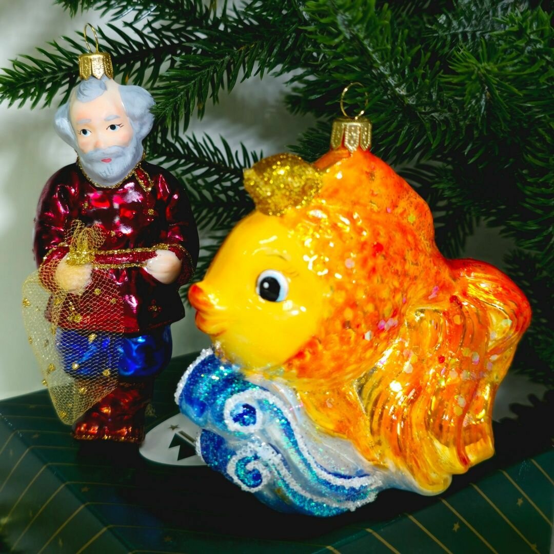 Irena-Co Набор елочных игрушек, стекло Дед - 12х5,5х4,5, Золотая рыбка - 10х10,5х5,5