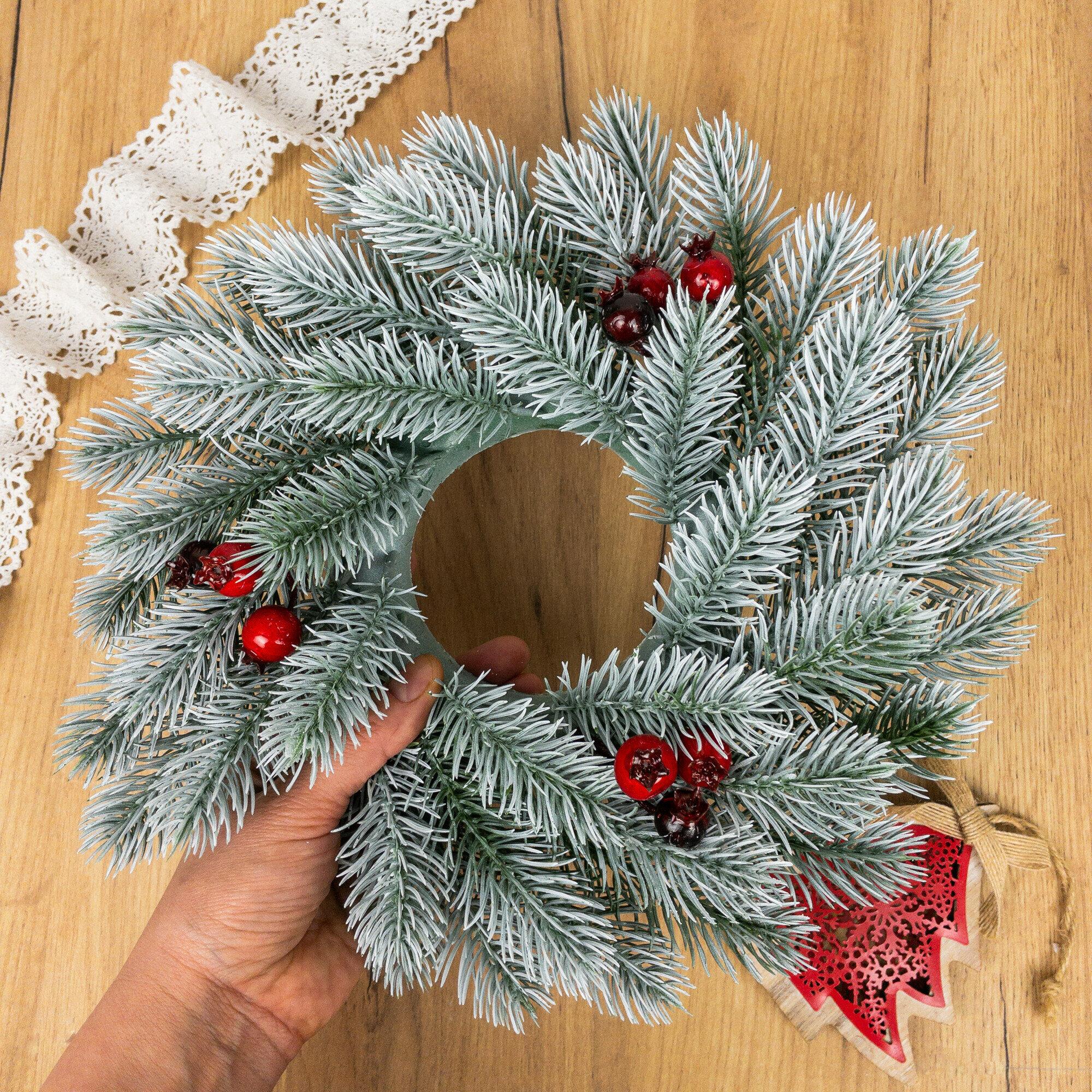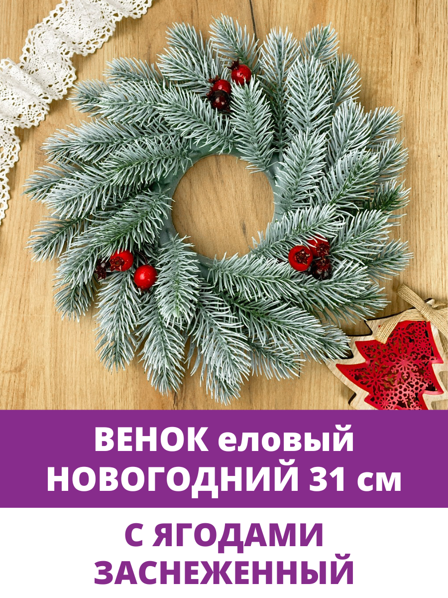 Отзывы на Венок новогодний еловый, с эффектом патины, заснеженности, с ягодами, искусственный, 31 см, 1 шт.